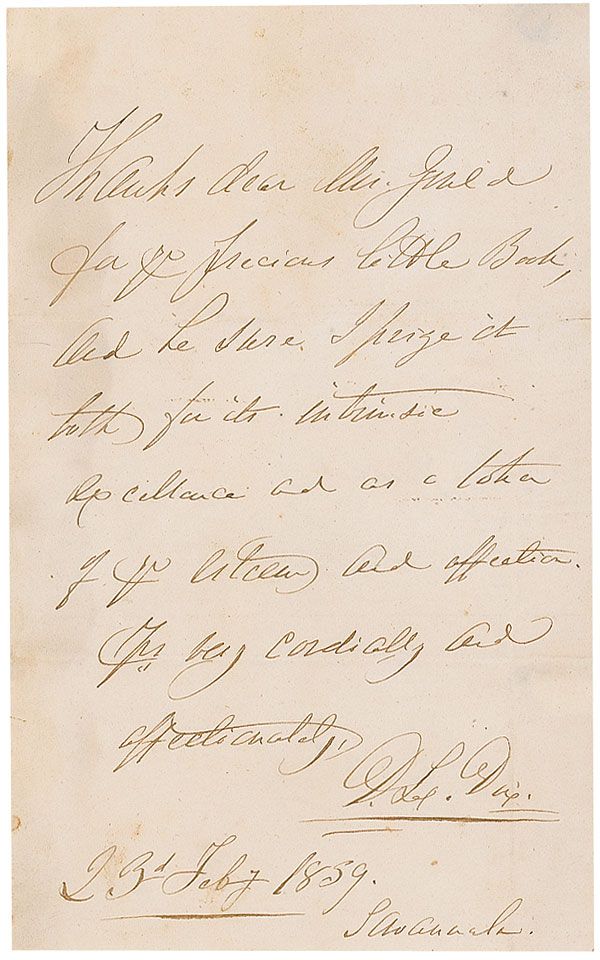 Philanthropist and reformer (1802–1887), she secured reforms in treatment of the insane. Uncommon ALS signed “D. L. Dix,” one page, 4 x 6.5, February 23, 1859. Short letter of thanks for a gift. In part: “Thanks dear…for yr precious little book, and be sure I prize it both for its intrinsic excellence and as a token of yr…affection.” In very good condition, with intersecting folds, one through a single letter of signature, and scattered toning.