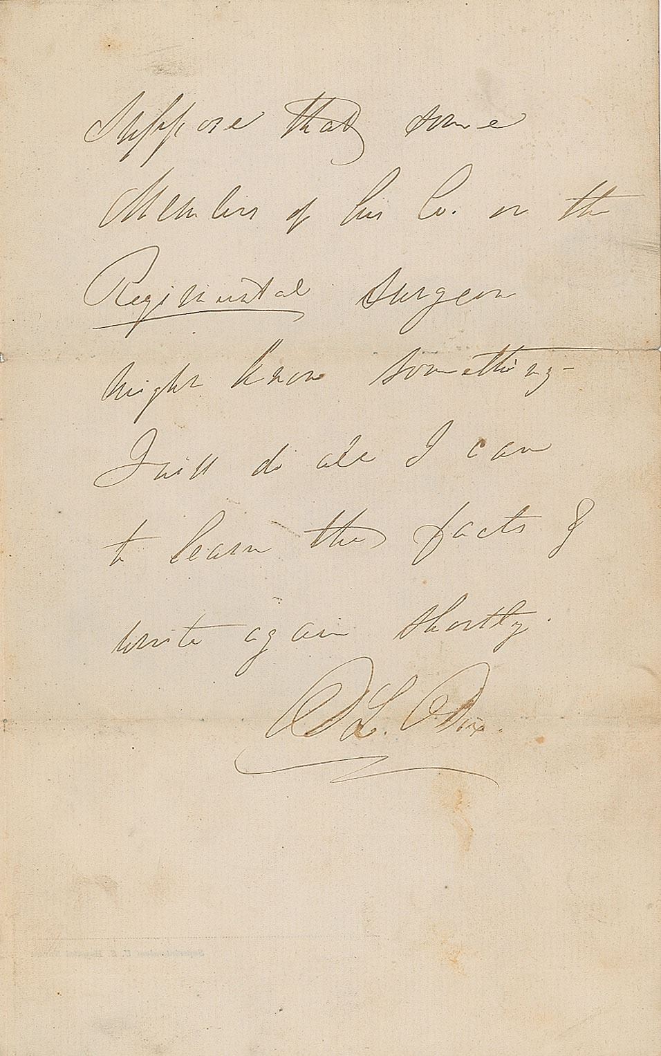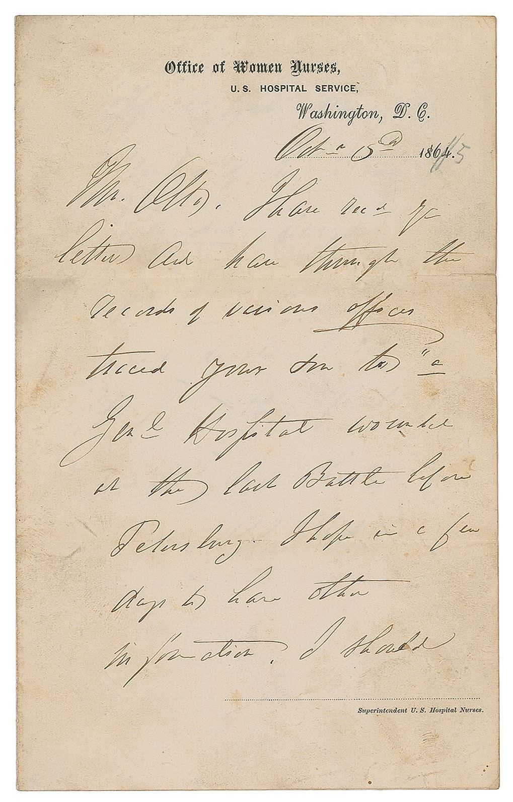 ALS signed “D. L. Dix,” two pages on two adjoining sheets, 5 x 8, Office of Women Nurses letterhead, October 5, 1865. Letter to Mr. Otto, in full: "I have rec'd yr letter and have through the records of various offices traced your son to a Gen'l Hospital wounded at the last Battle before Petersburg. I hope in a few days to have other information. I should suppose that some Members of his Co. or the Regimental Surgeon might know something. I will do all I can to learn the facts & write again shortly." In very good to fine condition, with overall soiling, and a split along one of the two mailing folds.