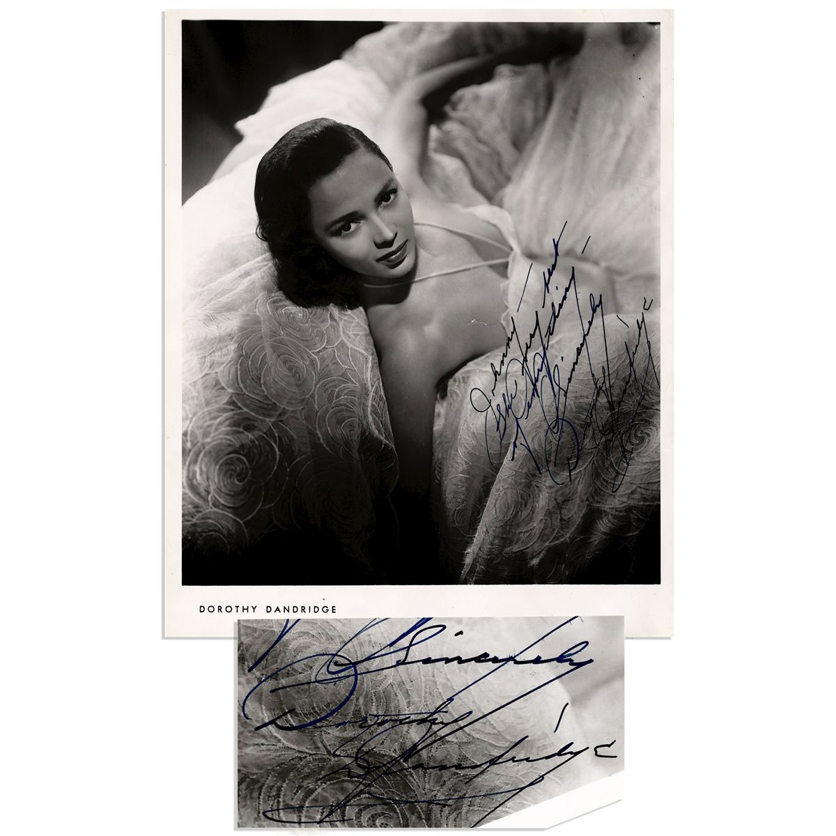 Glamorous black and white glossy photo of actress Dorothy Dandridge. Signed 8'' x 10'' photo is inscribed in blue ink: ''Johnny -- The very best of everything -- Sincerely Dorothy Dandridge''. One small .25'' tear along top border and minor creasing in a few spots, with glue residue on verso. Very good condition.