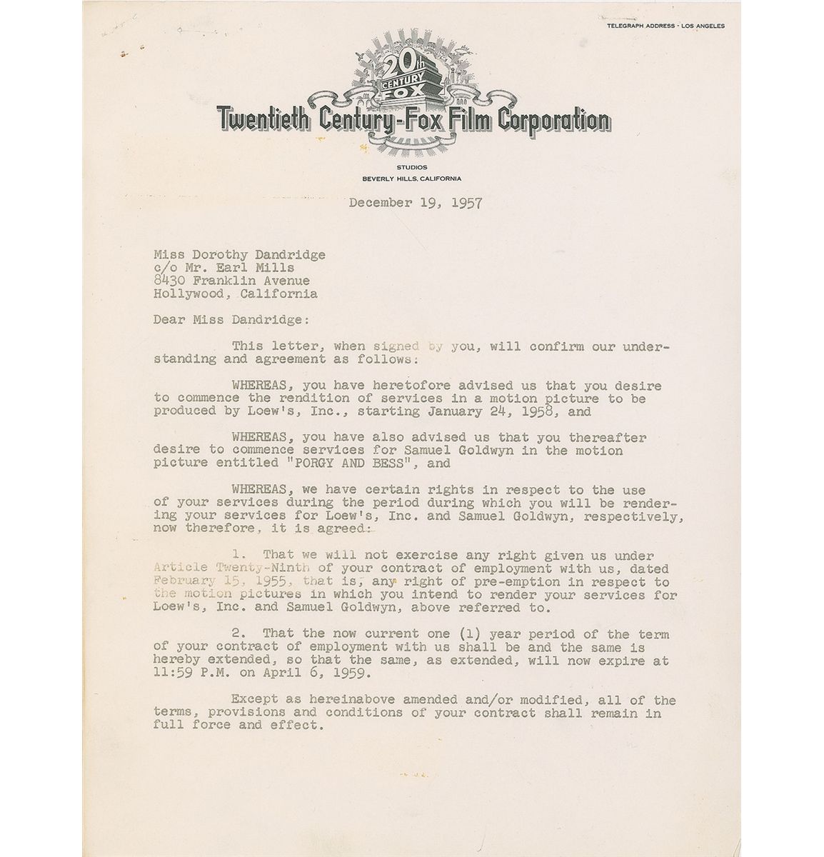 DS, two pages, 8.5 x 11, December 19, 1957. Agreement between Dandridge and the 20th Century Fox Film Corporation, in which the studio agrees to let her “commence services for Samuel Goldwyn in the motion picture entitled ‘Porgy and Bess.’” In fine condition, with expected document wear and staple holes to the top.