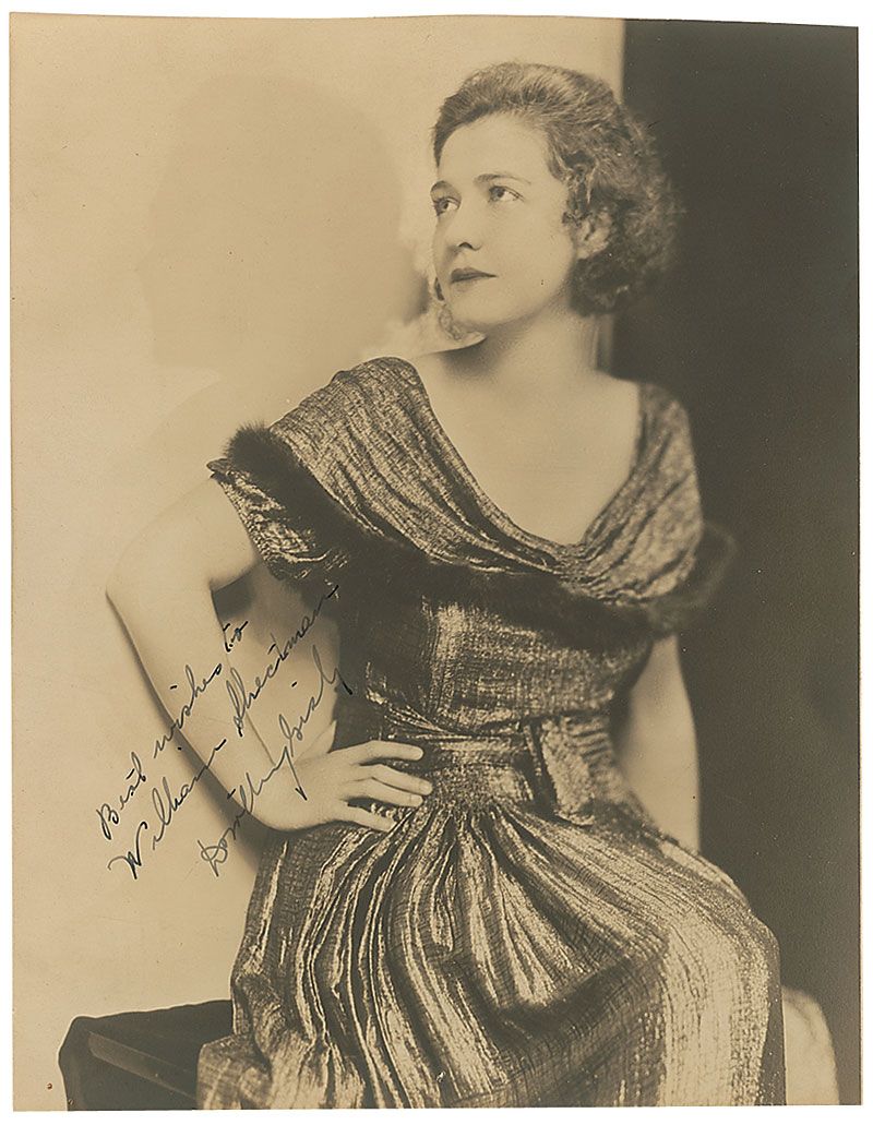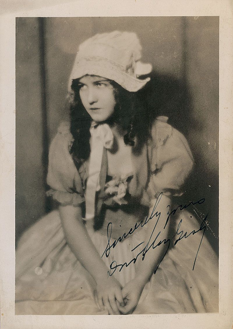 Two vintage matte-finish photos from Gish’s career, each signed in fountain pen, with Gish adding an inscription to one photo. In fine condition, with trimmed edges to one photo.