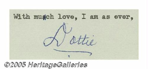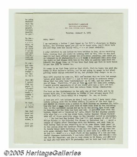 <B>Dorothy Lamour Signed Letter.</B></I> Here is a two-page letter from actress-singer Dorothy Lamour addressed to "John" and discussing various personal business interests, dated January 5, 1971, typed on her personal stationery and signed "Dottie" in blue ink. In superb condition, marred only by two lateral fold creases. <I>With COA from PSA/DNA.</B></I>