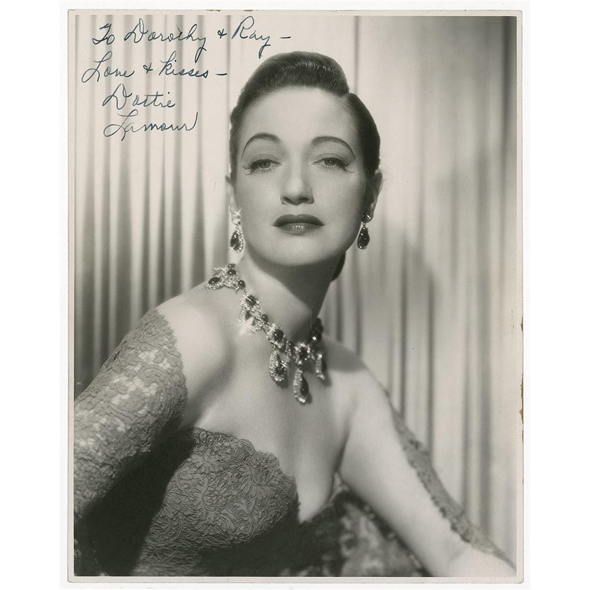 Lovely vintage matte-finish 7.5 x 9.5 photo of Lamour in a lace gown, signed and inscribed in fountain pen “To Dorothy & Ray–Love & kisses—Dottie Lamour.” In fine condition, with a bit of trivial edge soiling, and a couple of small creases.