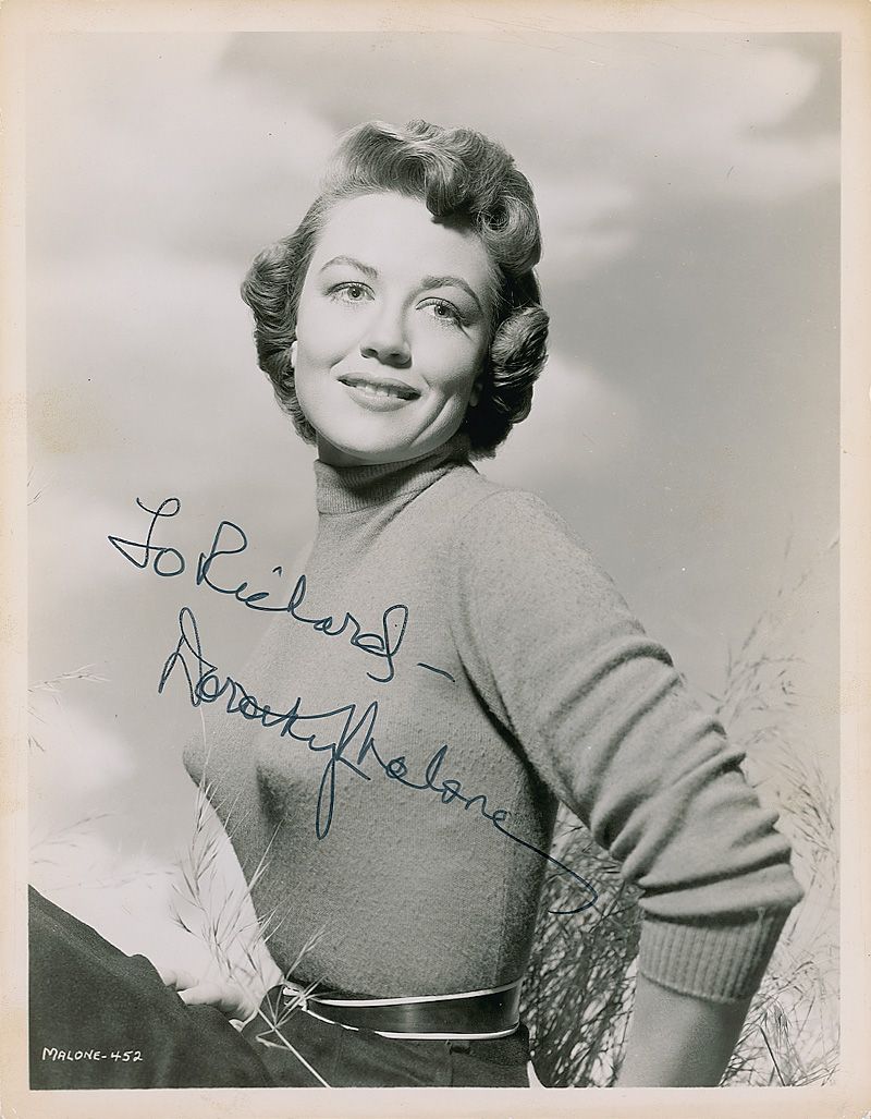 Glossy 8 x 10.25 photo, signed and inscribed in black felt tip “To Richard—Dorothy Malone.” In fine condition, with light creasing at top, scattered mild toning to edges, and some light spotting to finish.