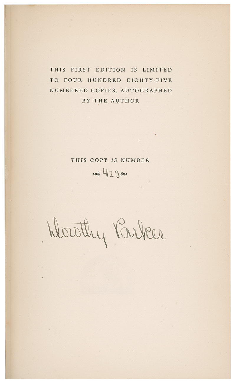 Signed book: Not So Deep as a Well. Limited edition first edition of 485 copies (This being No. 423). NY: Viking Press, 1936. Hardcover, 6 x 9.5, 210 pages. Signed on the limitations page in black ink by Parker. Owner’s notation to half-title page, mild toning to opening and closing pages and pastedowns, and light rubbing surface loss, and marks to covers, otherwise fine condition.