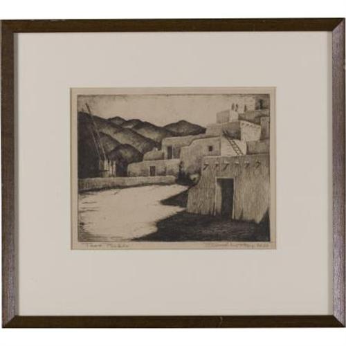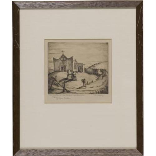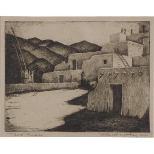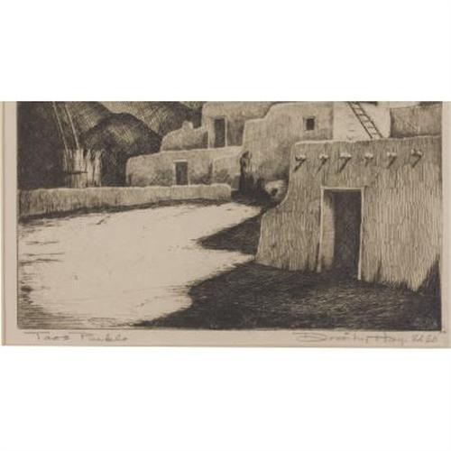<B>DOROTHY STAUFFER HAY (American, 1901-1974)</B></I><BR>Group of three:<I> Taos Pueblo </B></I>(Ed. 50), <I>San Antonio del Padua del Rancho, Pojoaque Valley, </B></I>and<I> Hofkirch </B></I>(Ed. 50)<BR>Etchings<BR> 8-3/8 x 8-1/4 inches, 4-1/4 x 5 inches, and 4-3/4 x 4 inches respectively (21.3 x 21.0 cm, 10.8 x 12.7 cm, and 12.1 x 10.2 cm)<BR>Two signed in pencil lower right:<I> Dorothy Hay Ed. 50 </B></I>and the other signed in pencil lower right : <I>D. Hay</B></I><B>Condition Report:</B> Overall good condition. All matted and framed, not examined out of frames.<BR><BR><b>Shipping:</b> Framed - with Glass, Small (<a target="_blank" href="http://www.heritageauctions.com/common/shipping.php">view shipping information</a>)