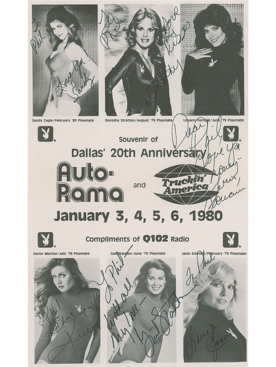 Playboy Playmate–turned–actress (1960–1980) who was murdered by her estranged husband at the age of 20. Uncommon promotional poster from the 20th anniversary of the Dallas Auto-Rama and Truckin’ America Show, 8.5 x 14, featuring Stratton and five other Playboy Playmates, signed and inscribed in black felt tip, “To Phil, Love & kisses, Dorothy,” Poster is also signed and inscribed by Sandy Cagle, Louann Fernald, Karen Morton, Gail Stanton, and Janis Schmitt. In fine condition, with a central horizontal fold.