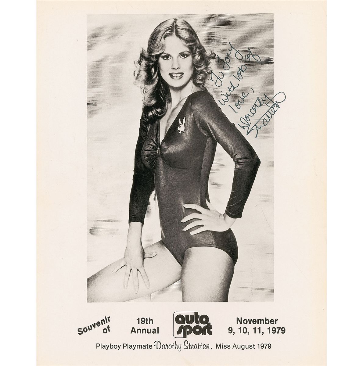 Playboy Playmate–turned-actress (1960–1980) who was murdered by her estranged husband at the age of 20. Rare 8.5 x 10.75 paperstock promotional photo from the 1979 Autosport Show, featuring Stratton in a Playboy leotard, signed and inscribed in black felt tip, “To Tony, with lots of love, Dorothy Stratton.” In fine condition.