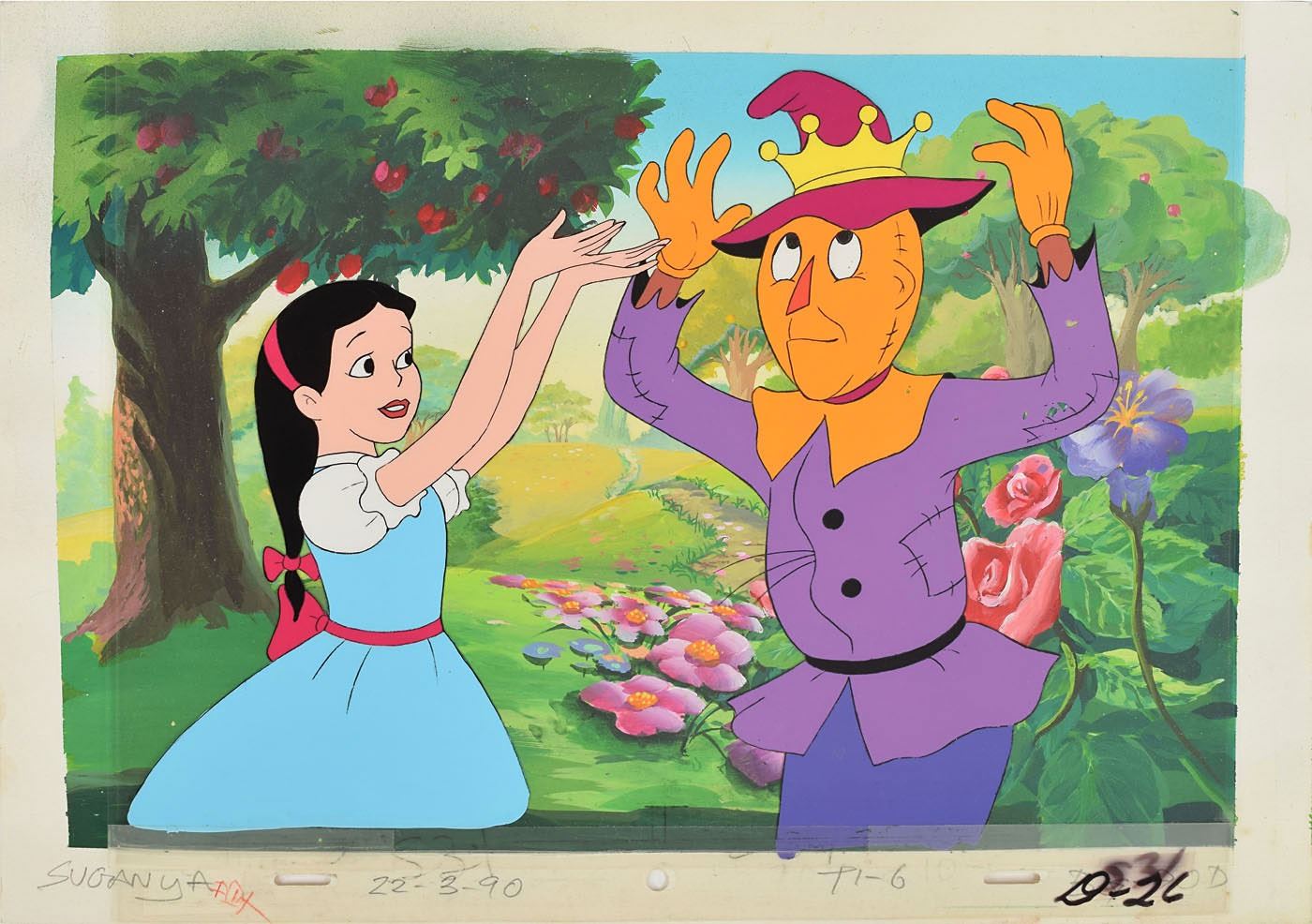 (Filmation Studios, 1972) Original production cel and production background featuring Dorothy presenting a crown to the Scarecrow from Journey Back to Oz. The cel is placed on a vivid original hand-painted production background. Total image measures 11 x 8.5, with overall dimensions of 14.75 x 10.5. In fine condition. An official sequel to the classic 1939 MGM film, Filmation's Journey Back to Oz began production in 1962 but ran out of funding and was halted for nearly eight years. Most notably, this would have been Liza Minnelli's first major credited role—following in her mother Judy Garland's footsteps as the voice of Dorothy—as her part was recorded in 1963. The movie was finally completed in 1971, then released in the UK in 1972 and the US in 1974. An extremely attractive, appealing piece.