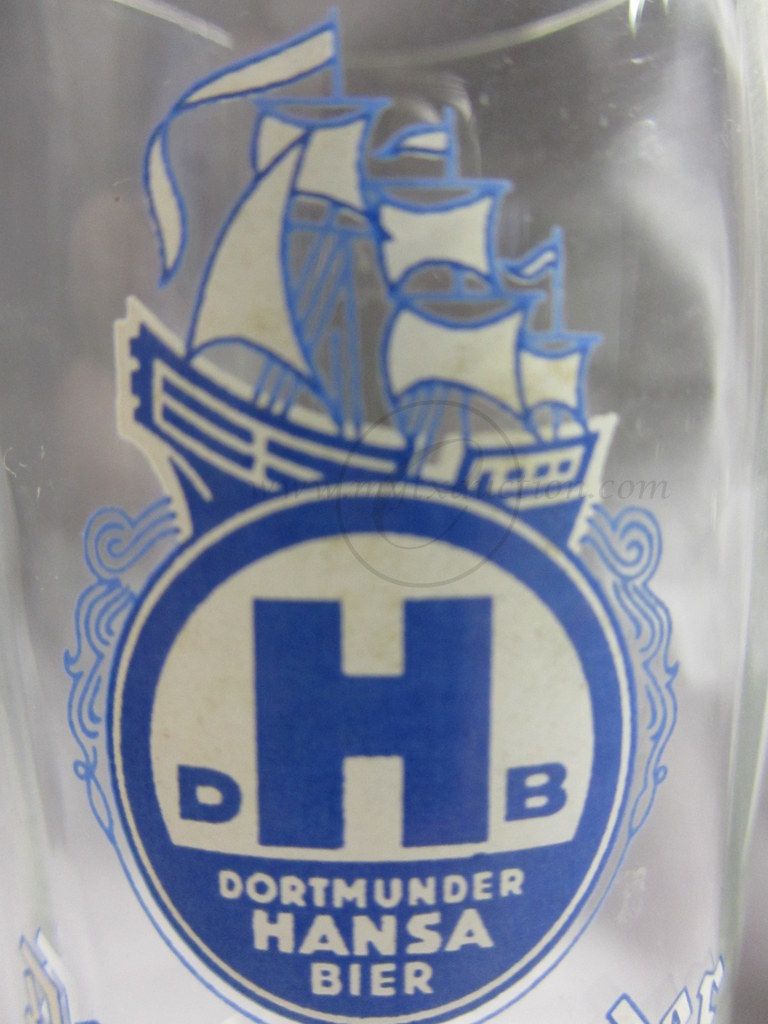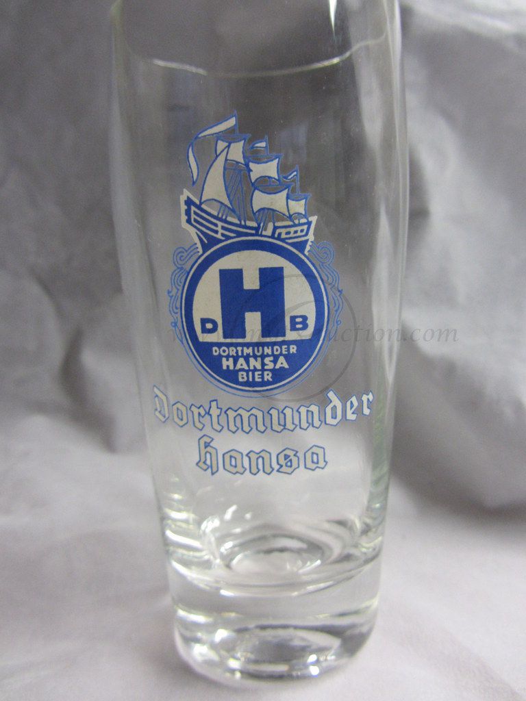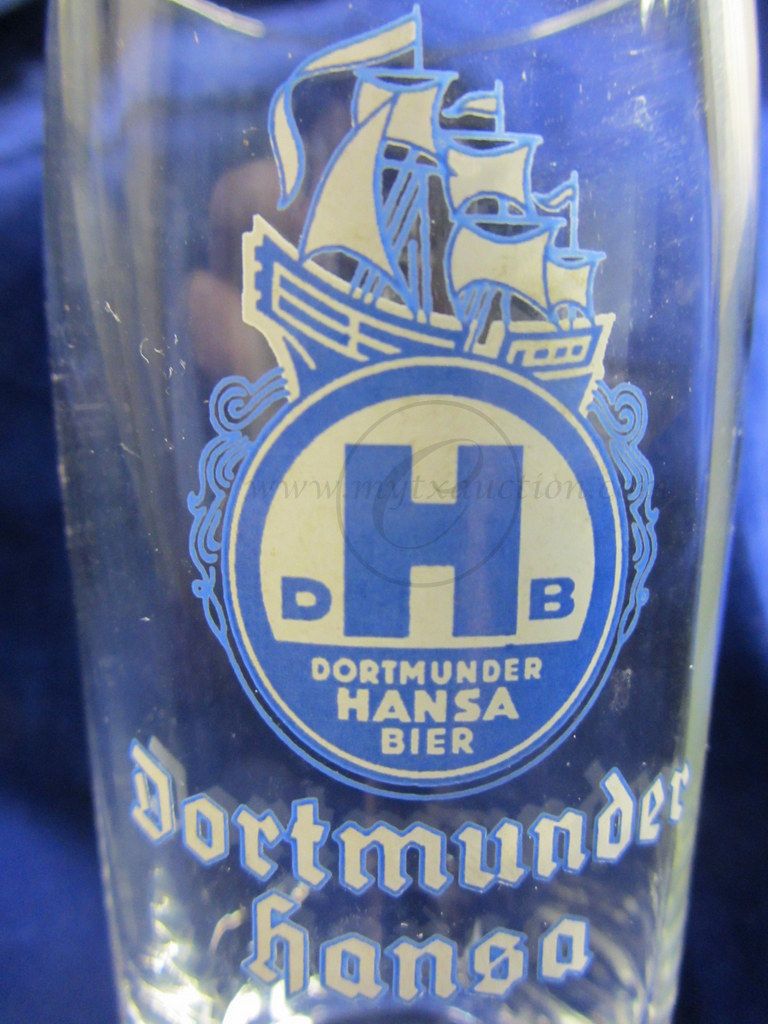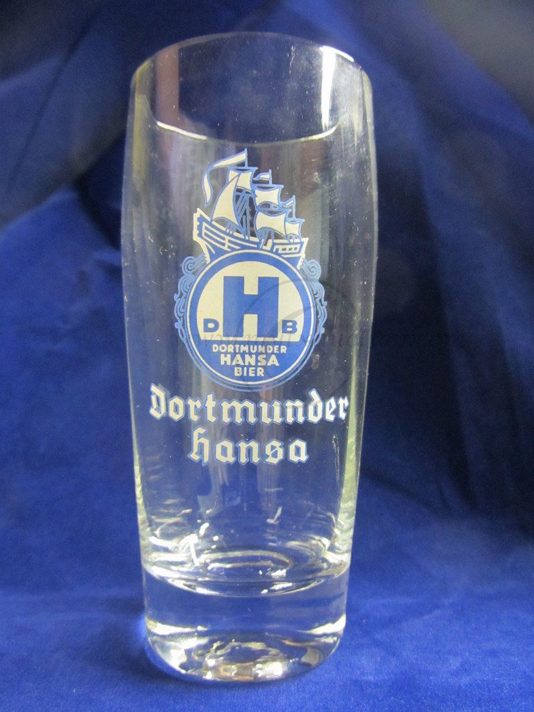 German Dortmunder Hansa Bier glass has the 1924 trademark stamp on the front. Holds 0.2L 5.25" tall x 2.25" opening x 1.75" across base. The clear glass is in very fine condition no chips, nicks or cracks noticed.