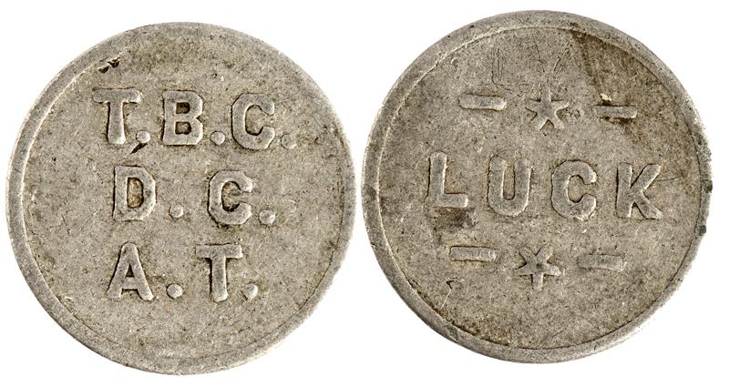 Obverse: T.B.C. / D. C. / A. T.; reverse: Luck. Al, 22mm. Fine condition, unlisted in Spooner.