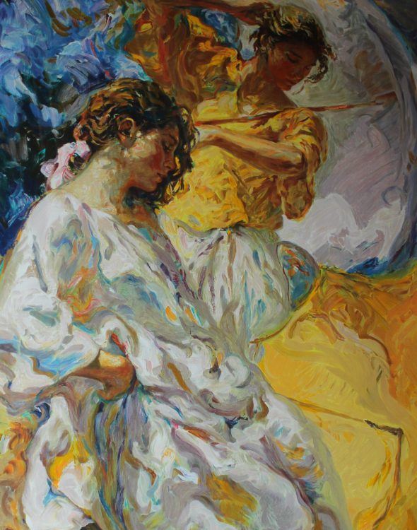 Dos Figuras by Royo is a framed limited edition serigraph of two women in their gowns. The size is 62" x 54 1/2".