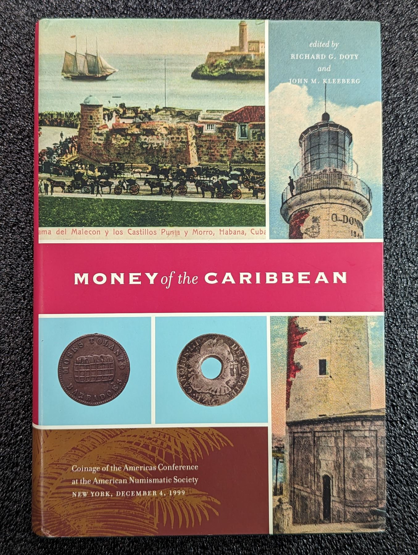 Doty, Richard G. & John M. Kleeberg. MONEY OF THE CARIBBEAN. American Numismatic Society, New York. 1999. 8vo. viii, 318, (2) pages. Original turquoise cloth, lettered in silver, jacket. Tables. b&w historical, document, engraving and coin photos throughout. Errata sheet laid in. Jacket/Book Fine. This book is a collection of papers presented at the 1999 Coinage of the Americas Conference, (COAC) including studies of the Spanish mint at Santo Domingo, Bermuda hogge money, a palm-tree countermark attributed to Haiti, holey dollars of Prince Edward Island, Jewish merchant tokens from the Caribbean, the 'key' countermark used in Cuba in the 19th century, and the 1897 Cuban souvenir dollar. Lot weight: 2 lbs 1oz. Subject(s): Spanish American, Caribbean Coinage.