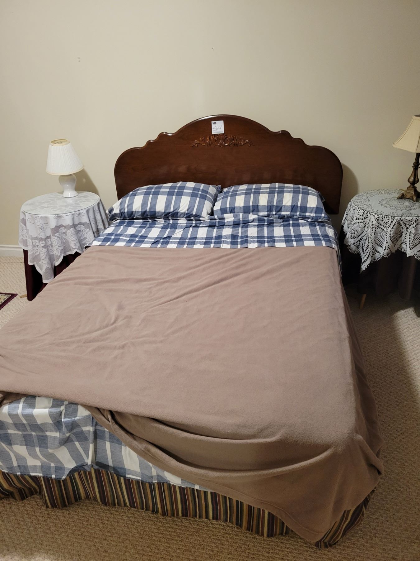Double Bed Frame, Mattress & Boxspring with 2 Round Side Tables & Lamps