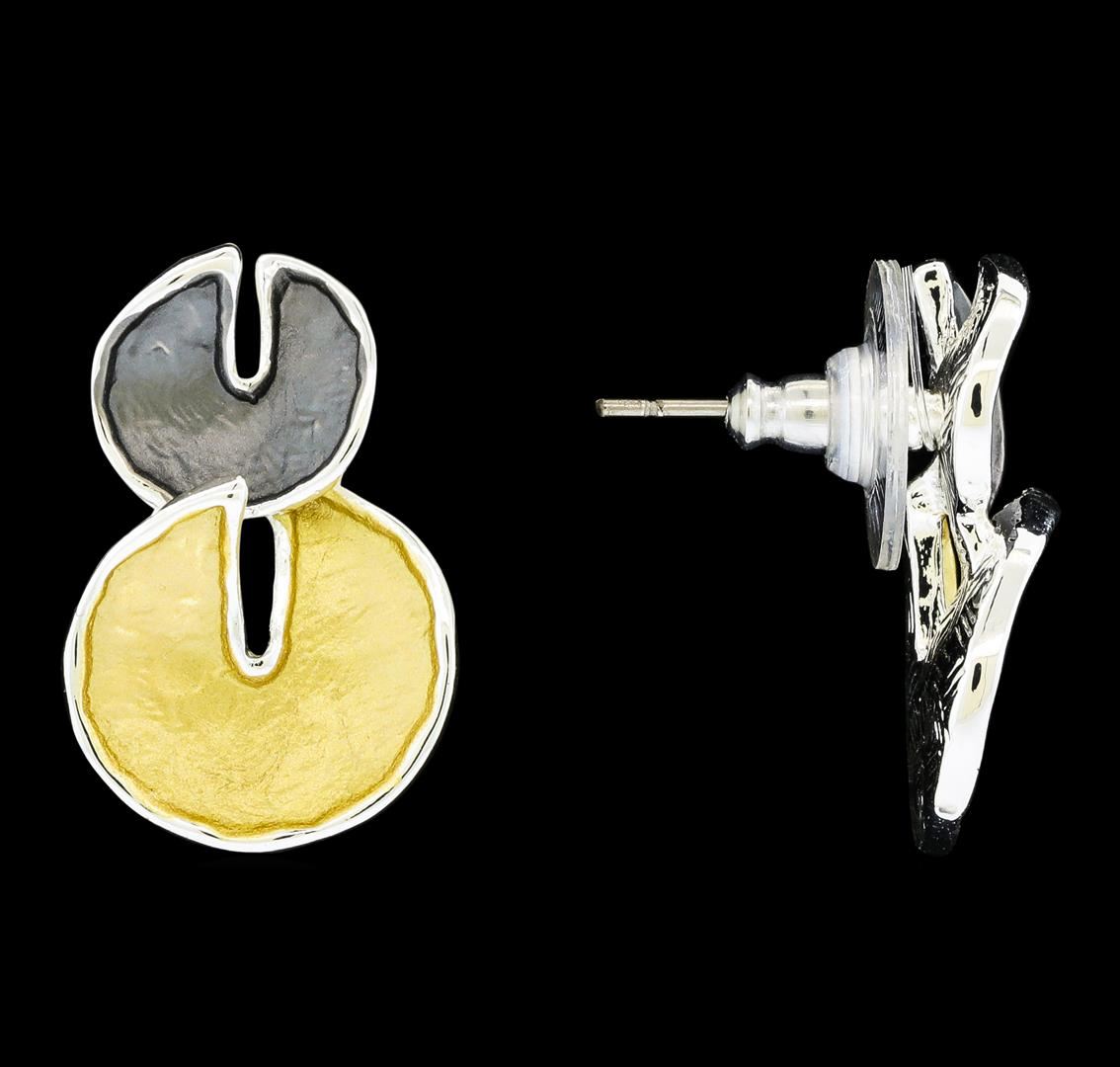 High end designer jewelry. Double Circle Dangle Earrings - Rhodium Plated. Rhodium Plated Post Set. Gold/ Grey/ Slv. 1inch. Total Weight: 4.3 grams.
