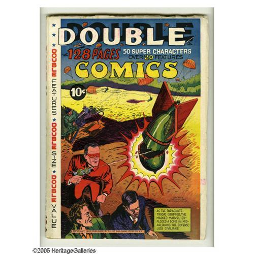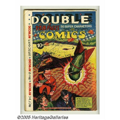 <B>Double Comics 1940 Edition (Elliot, 1940) Condition: VG/FN.</B></I> Every issue of " "<B>Double Comics</B></I> was unique, as the contents were two (always two) remaindered, unsold comic books from other publishers re-bound to make one 128-page issue. In this case, the contents are Fox's " "<B>Mystery Men</B></I> #5 and 6. Note that CGC could not encapsulate this comic due to a significant overhang at the top and side. While Overstreet lists a VG value of $476 and a FN value of $714 for 1940 issues, the Guide notes, ""The actual contents would have to determine its price... value would be approximately 50 percent of contents,"" which in this case results in an approximate Overstreet value of $1,100. <BR><BR><B>Important notice:</B> Heritage usually auctions material at the rate of 200-250 lots per hour. On some occasions eBay Live bid software or the Internet may not be able to keep up with the pace of the auction. We recommend placing a realistic absentee bid now as insurance to avoid disappointment. Occasionally the auctioneer may eliminate or reject an eBay Live bid, and the auctioneer may also reopen a lot after the close of the eBay live bidding (usually because we missed an audience bid), and may reject your bid even if it shows you as the winning bidder. By bidding via eBay Live, you agree that Heritage may award the lot to another bidder at its sole discretion under the circumstances described above or any other reasonable circumstances. Since eBay bids are not shown to us until we open the lot on the floor, we treat those bids just like floor bids. In most cases the floor responds before the eBay bid is presented to us, due to Internet lag time, so for consistency we have made it a policy that floor bids are always considered first over tie eBay live bids. Also please note that all Heritage lots purchased through eBay Live carry a 20% Buyer's Premium. Please make sure you read the Terms and Conditions before you bid. This lot is being auctioned in conju