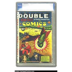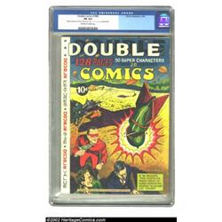Double Comics #nn (1940 Edition) (Elliot, 1940) CGC FN 6.0 Off-white to white pages. Double Comics consisted of an almost endless combination of pairs of remaindered, unsold issues of comics. They represented most publishers, usually mixing publishers in the same book. This 1940 issue contains copies of Super Spy #1 and Amazing Mystery Funnies #24. Overall, this is a nice copy. It has a crease down the middle of the cover, and few other small imperfections. A strange and difficult book to find, this will make an unusual addition to any collection. Overstreet 2002 FN 6.0 value = $681. Important notice: We expect to be auctioning lots at the rate of 200-250 per hour. Sometimes eBay Premier live bid software cannot keep up with that pace, so we strongly recommend that you place a realistic proxy bid now as insurance to avoid disappointment. Also please note that all Heritage/CAA lots purchased through eBay Premier carry a 20% Buyer's Premium. Please make sure you read the Terms and Conditions.