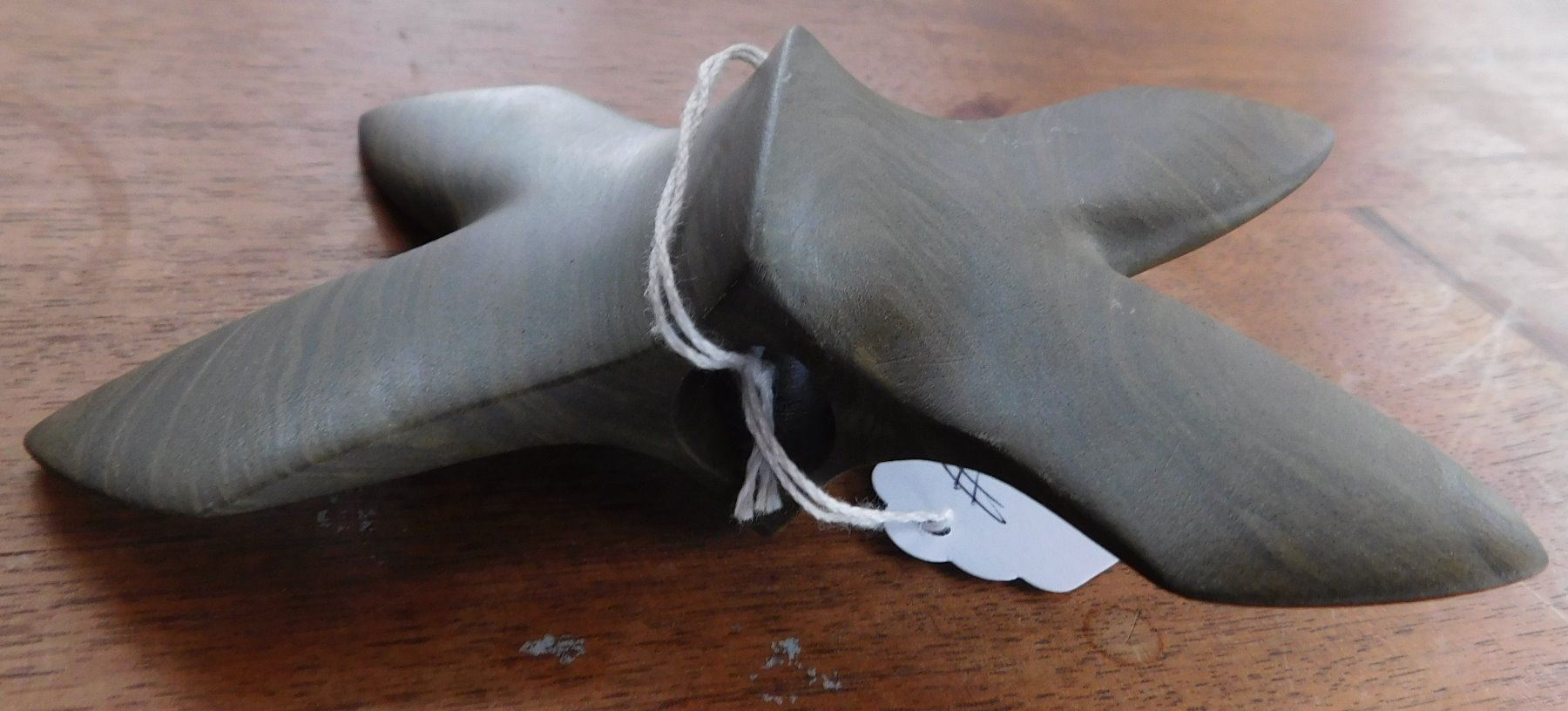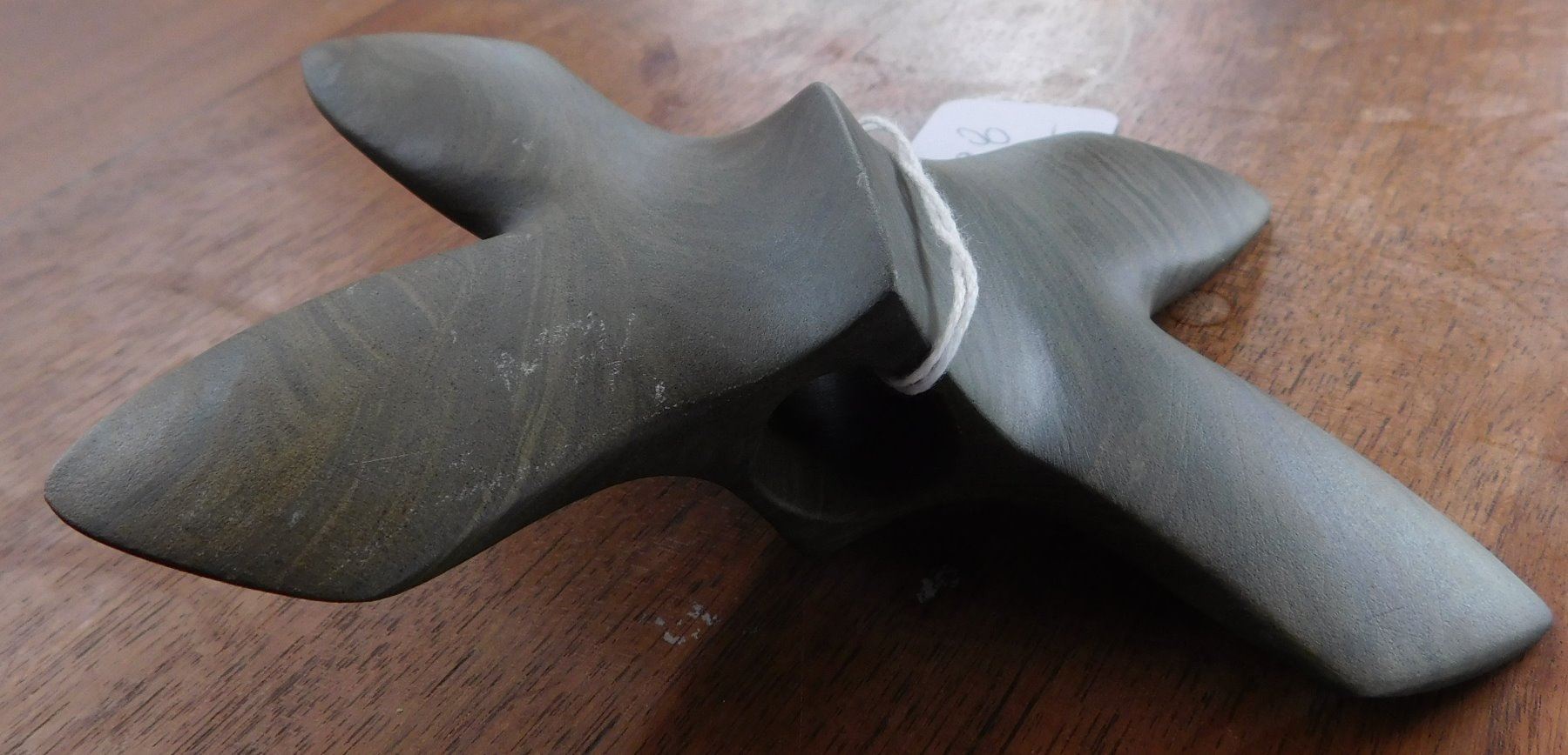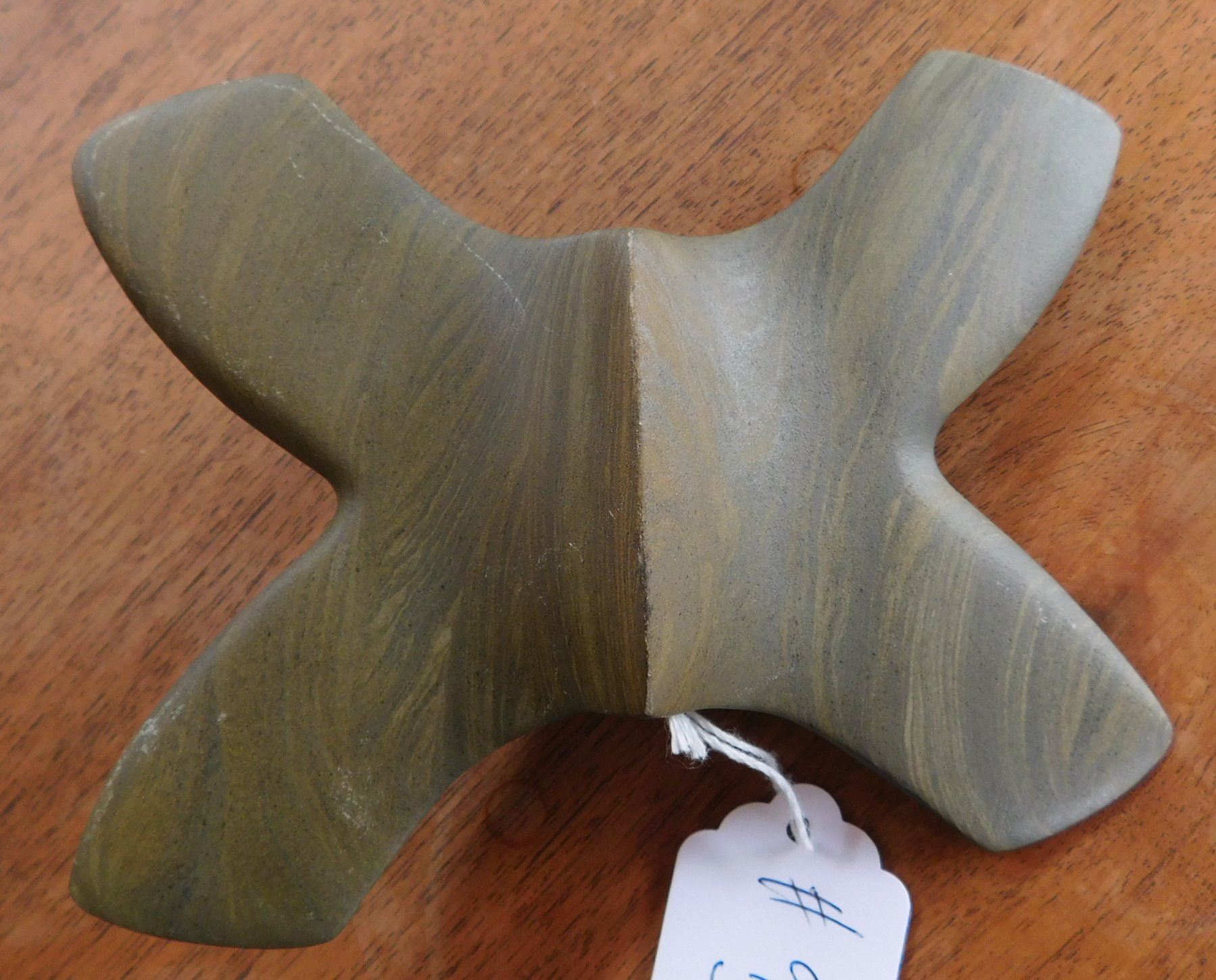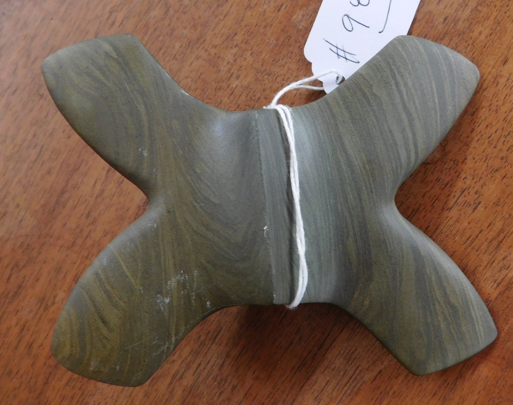 Double-Crescent Bannerstone, pre-historic item. Made of banded slate, the item measures 5" x 3 3/4" x 1 1/4". Wabash County, Indiana. From an old, 1960s California collection. Condition: Good, minor wear, see images. Shipping: $23.50 w/insurance and signature.