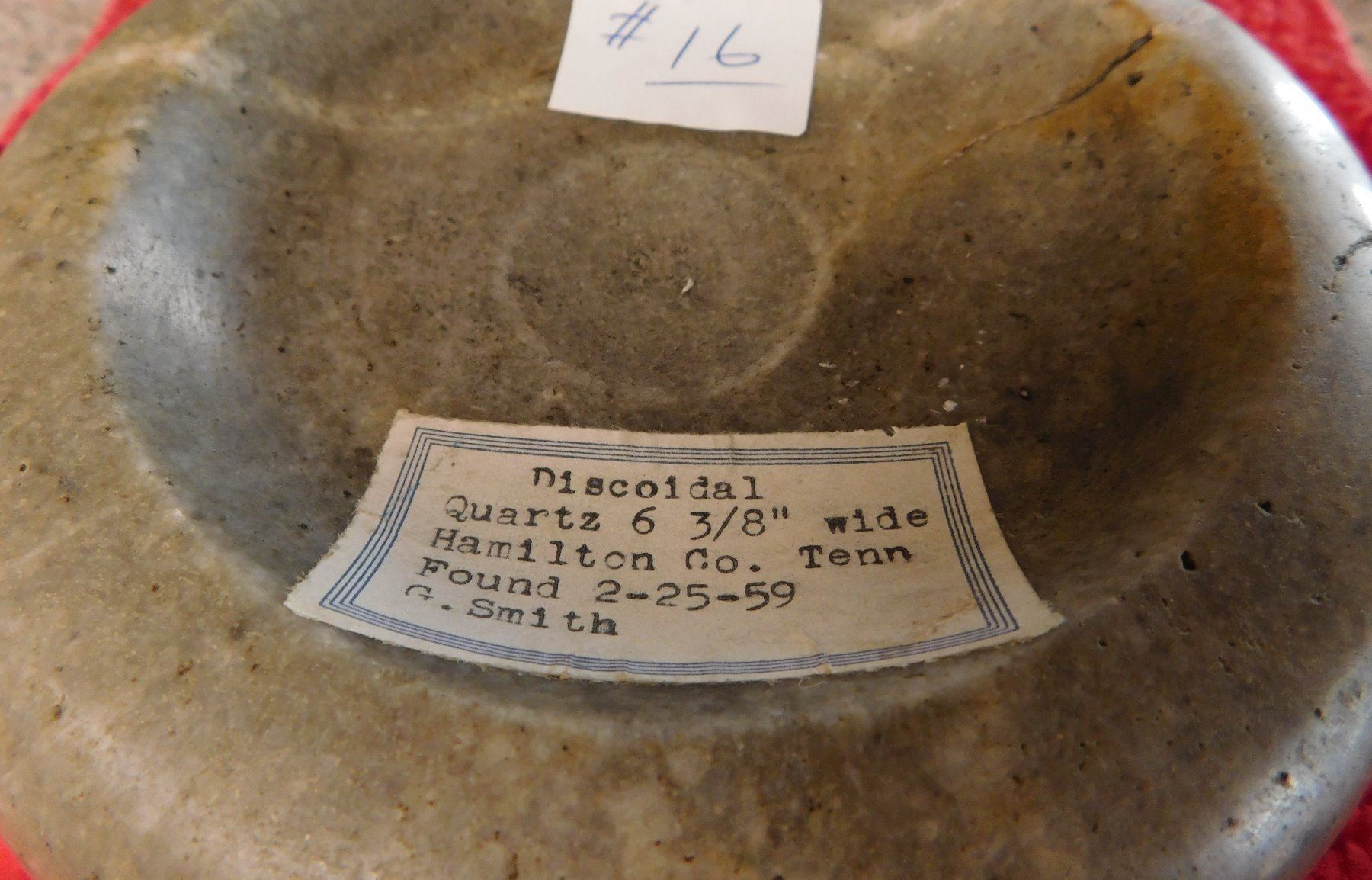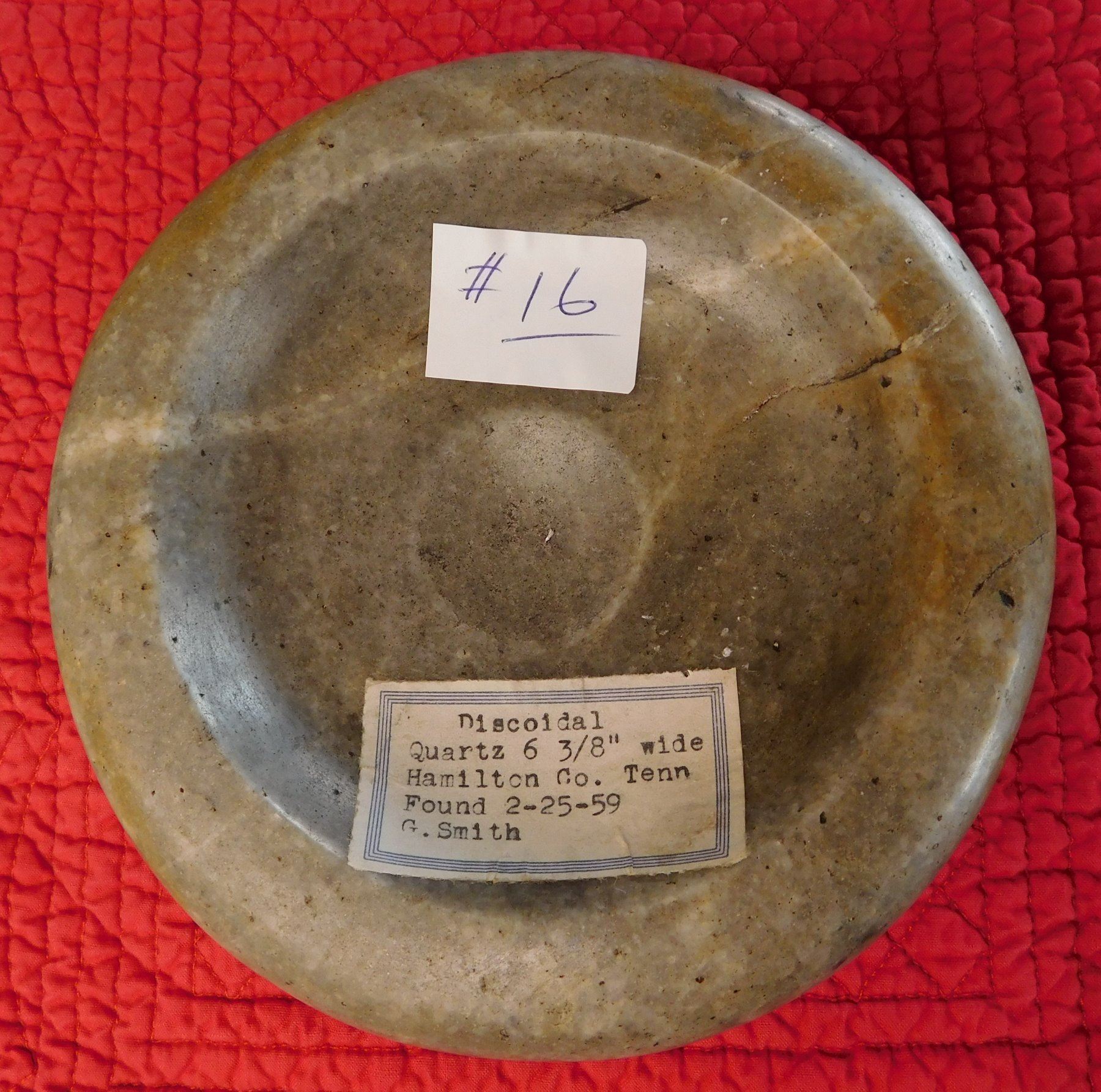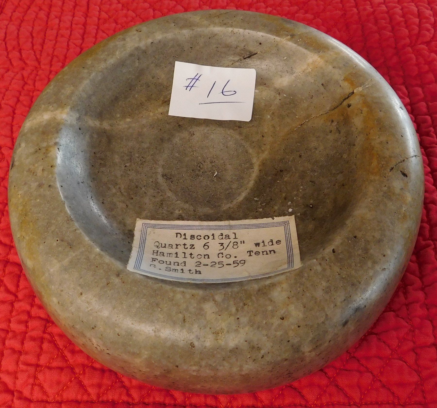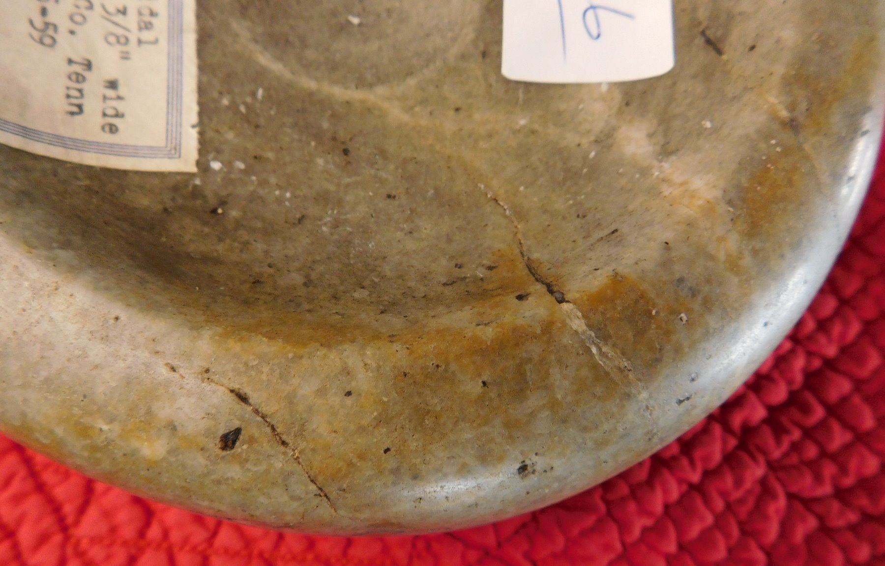 Double-Cup Discoidal, pre-historic item. Made of flint, the item measures 6 3/8" x 2 1/3". Hamilton County, Tennessee. Large discoidal, very fine. Condition: Good, see images. Shipping: $26.50 w/insurance and signature, due to value.