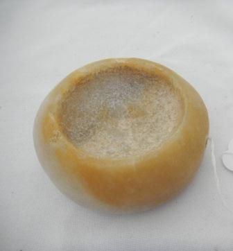 Prehistoric Double Cupped white and yellow quartz discoidal, measuring 3 1/4 by 1 1/2. This item is from an old Illinois collection. The center is translucent and it has a couple of use dings on the cup edge