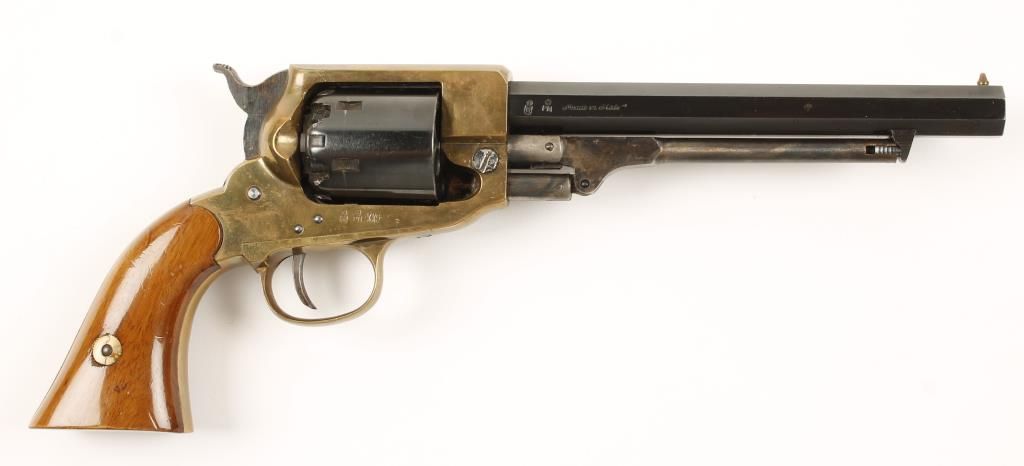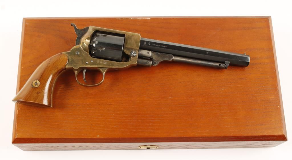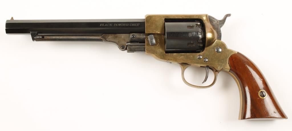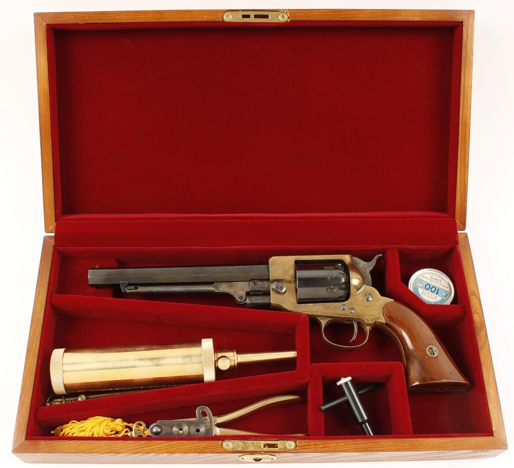 Cased replica black powder single action 6-shot percussion pistol. Blued 7" octagon barrel. Case colored loading lever, hammer and trigger. Blued cylinder. Brass frame and trigger guard. Not cut for a shoulder stock. Lined hardwood case with loading and maintenance tools and a key. Condition is good plus. *Antique Firearm*