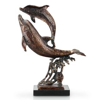 Double Dolphin Cast Iron Sculpture - 12" X 8" X 3.5" - Lost Wax Cast- Mounted On Marble Base
