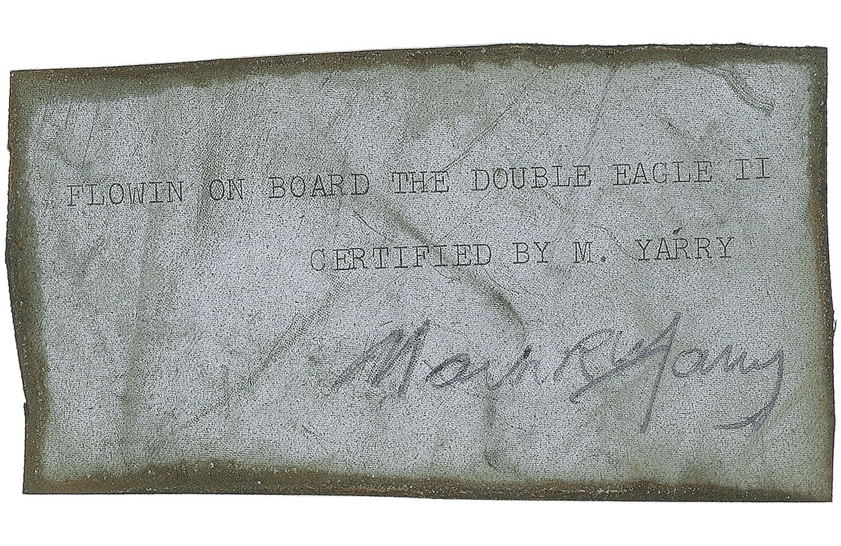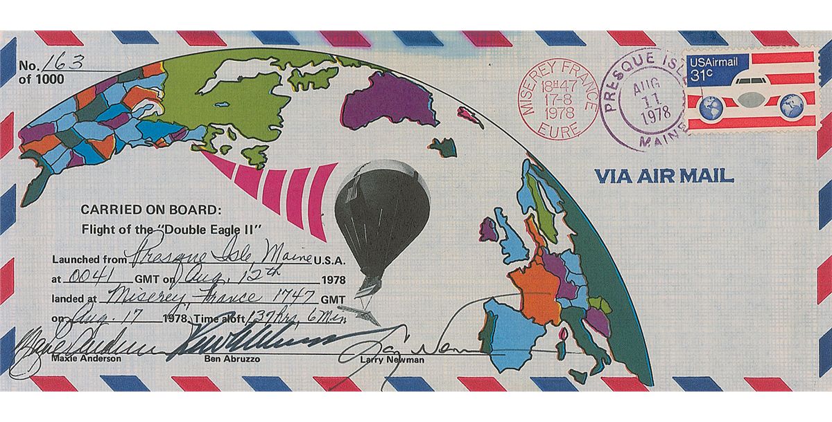 Limited edition flown commemorative air mail cover, 9.5 x 4, numbered 163/1000, signed in ink and felt tip by crew members Maxie Anderson, Ben Abruzzo, and Larry Newman. Cover bears August 11, 1978, Presque Isle, Maine, and August 17, 1978 Miserey, France, postal cancellations. Also included is a 4 x 2.5 swatch of the balloon fabric used in the flight, certified by Mark Yarry. In fine condition.