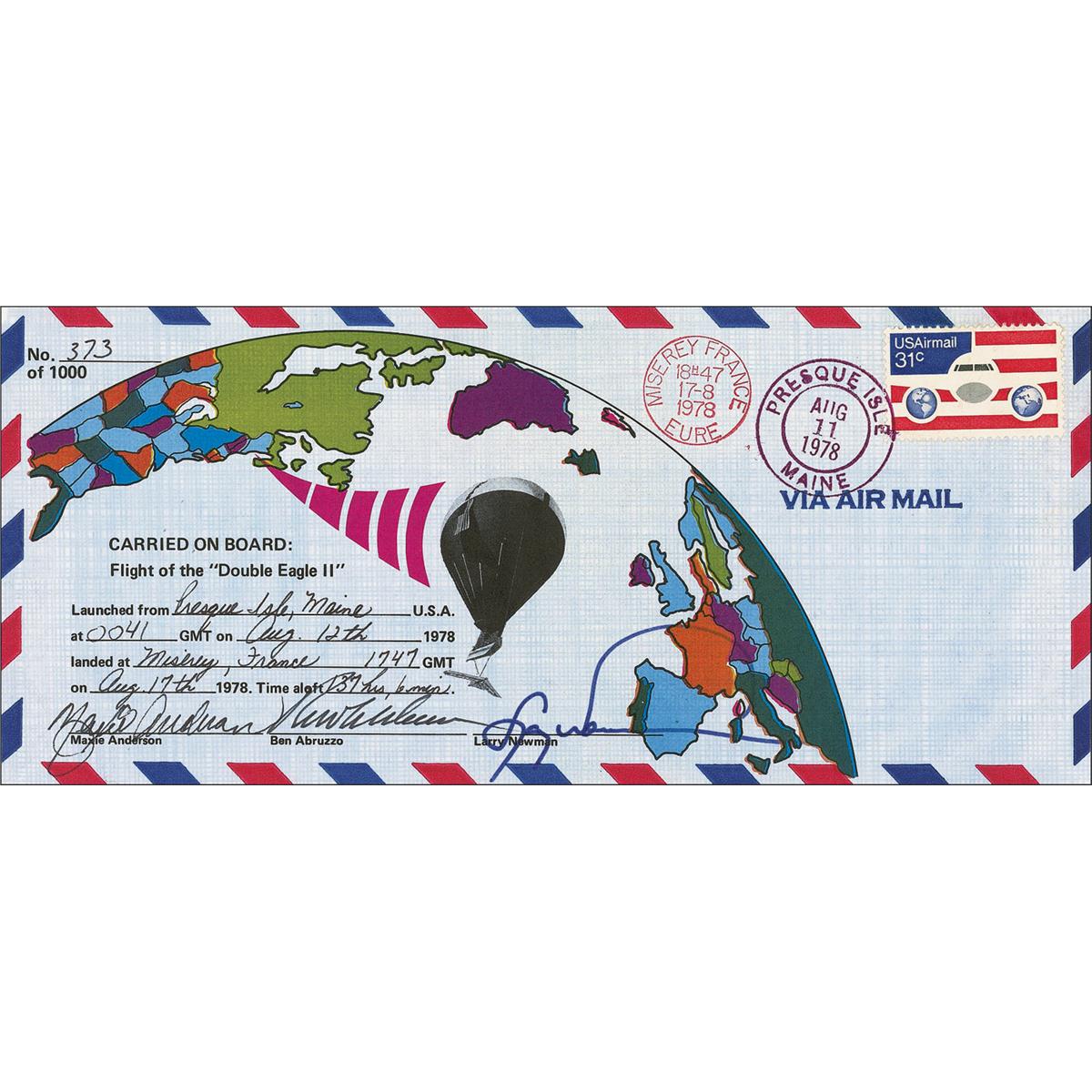 Balloon that became the first balloon to cross the Atlantic Ocean when it landed on August 17, 1978, in Miserey near Paris, 137 hours six minutes after leaving Presque Isle, Maine. Limited edition flight flown commemorative air mail cover, 9.4 x 4, #373/1000, signed in ink and felt tip by crew members Maxie Anderson, Ben Abruzzo, and Larry Newman. Cover is postmarked August 11, 1978, Presque Isle, Maine, as well as an August 17, 1978 postmark from Miserey, France. Cover comes in its original presentation folder with a printed biography of the trip and an actual 1.75 x 1 swatch of the actual Double Eagle II balloon fabric. In fine condition.