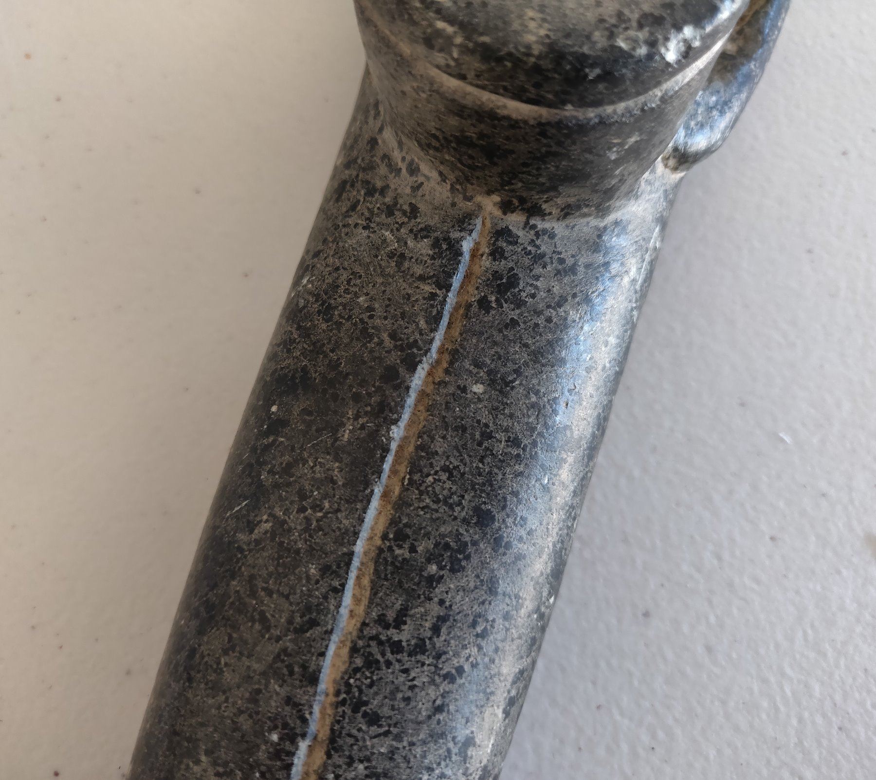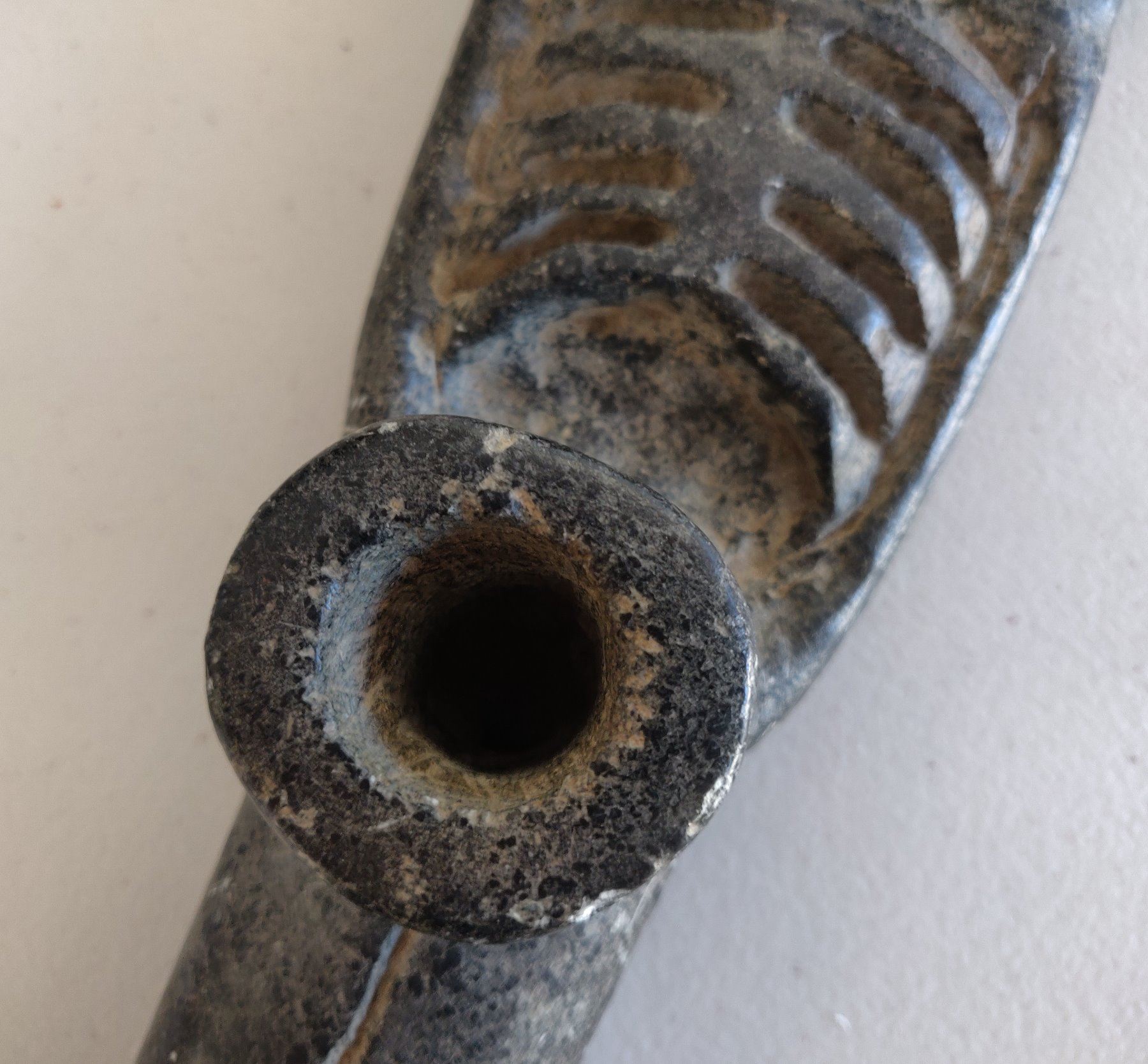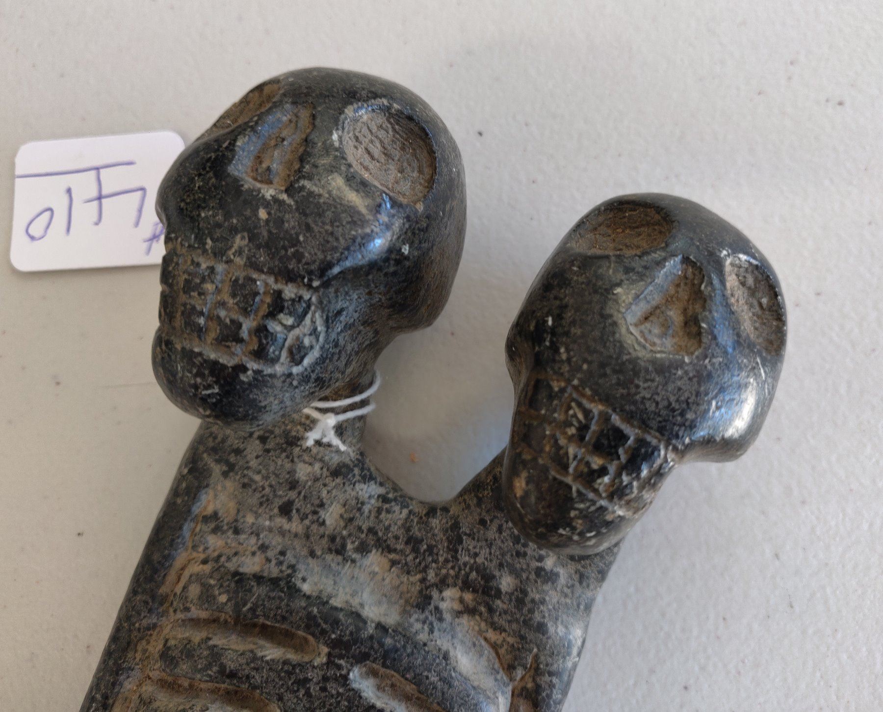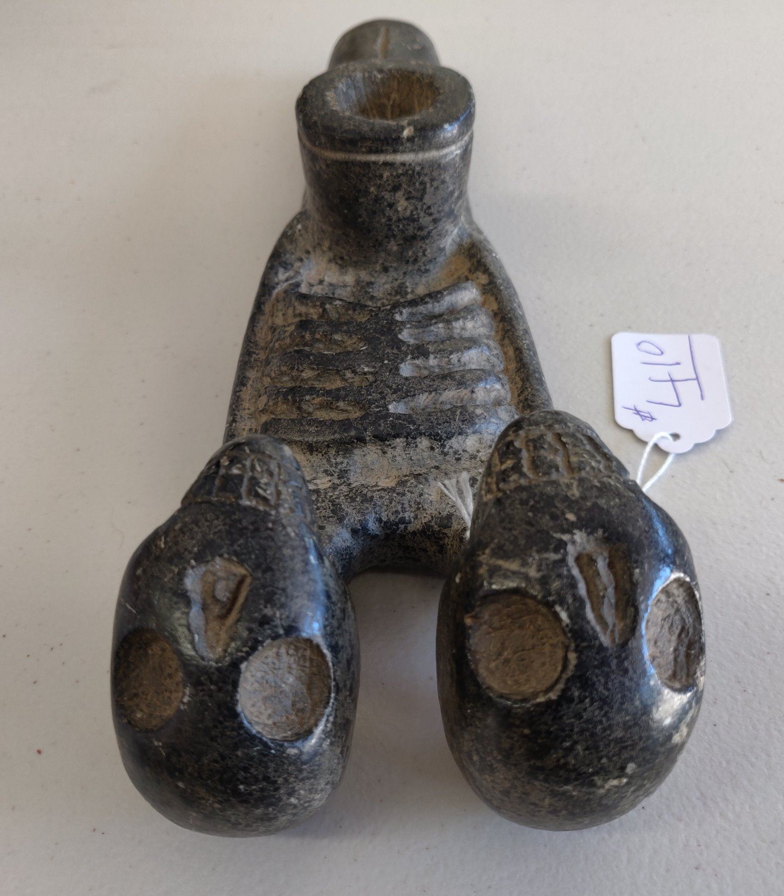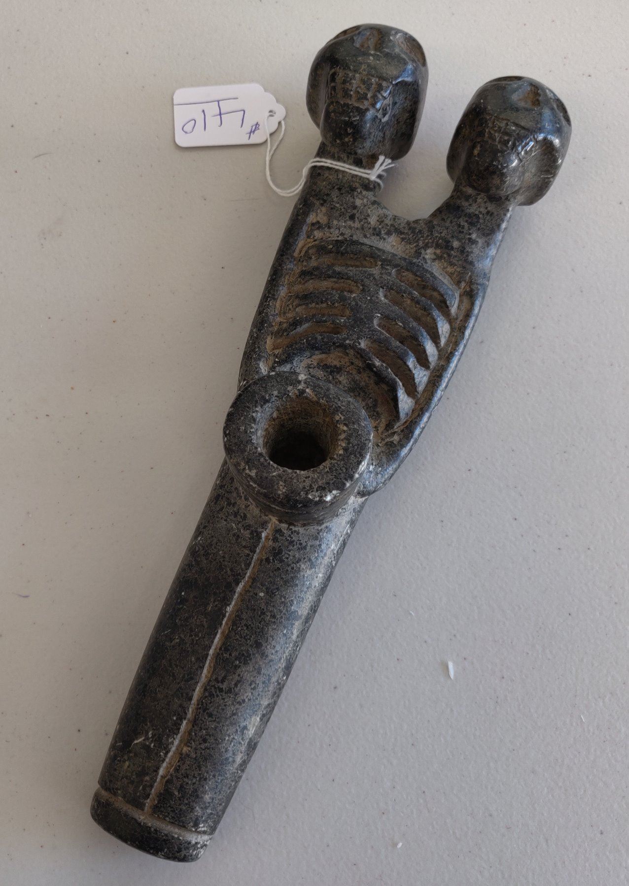 Double Effigy Pipe, pre-historic item. Made of steatite, the item measures 11" x 4" x 2 1/2". Central Georgia. Condition: Nicks and scratches, see images. Shipping: $42.50 w/insurance and signature, due to value.