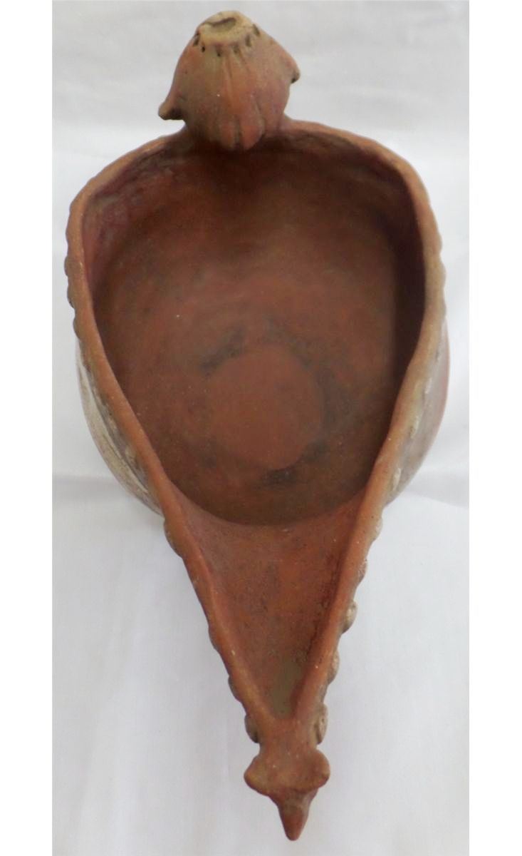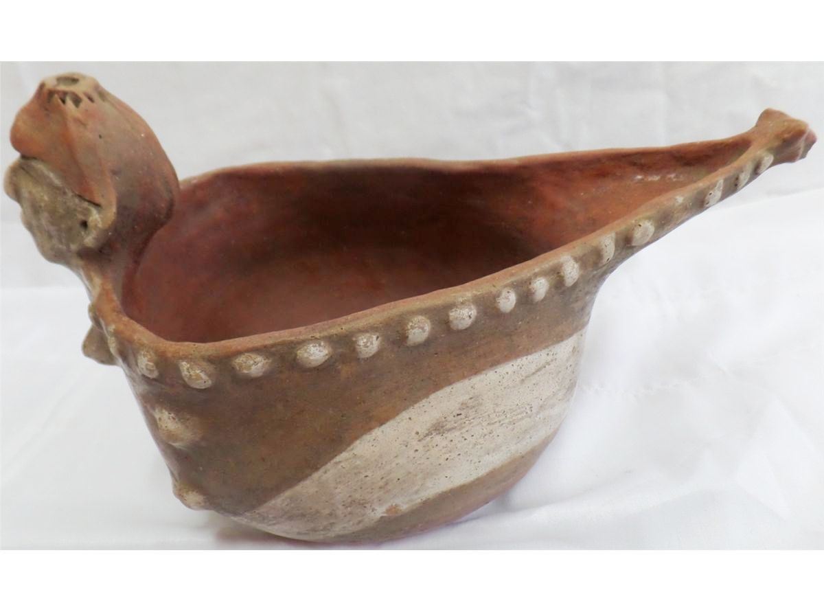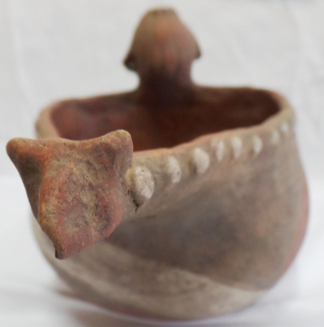 Double Effigy Quapaw-style Pot from Arkansas. Age unknown. Pot measures 11" x 5". This is a polychrome figural dipper. Condition: Very good, see images. Shipping: $24, must be double-boxed.