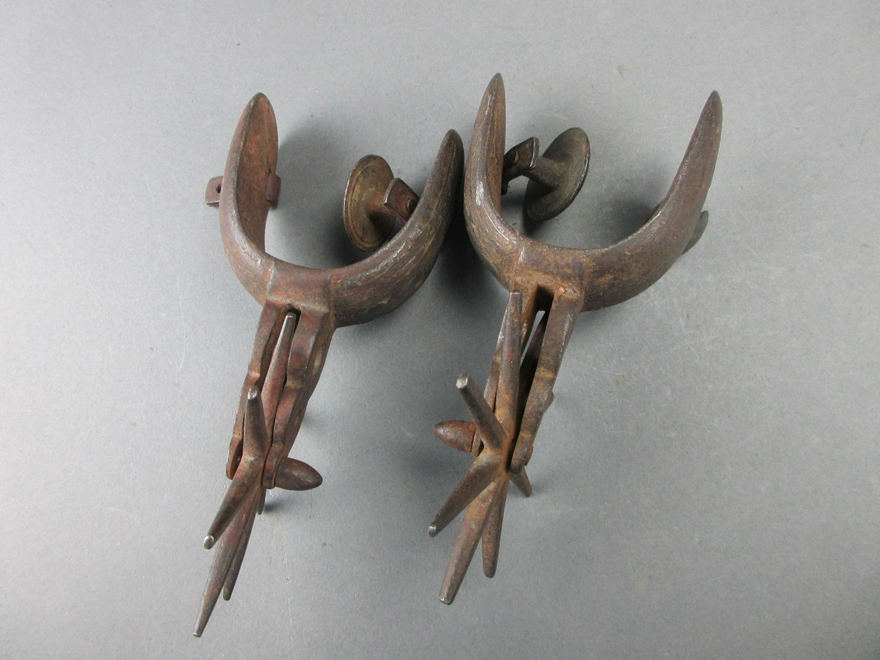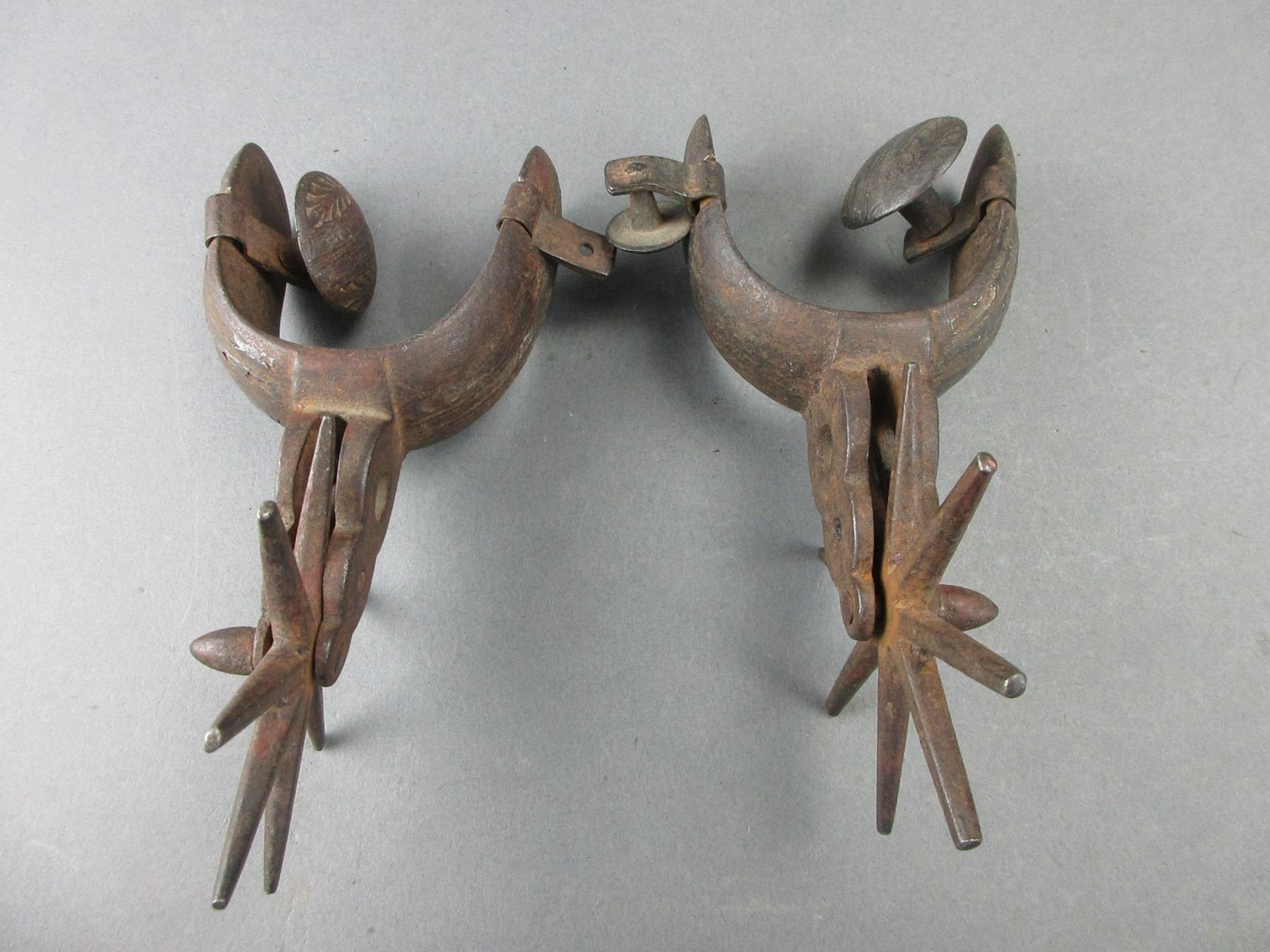 Double Engraved Chihuahua Iron Spurs- 1.6" Bands- 2.5" Shanks- 7 Point 4" Rowels- Fair Condition