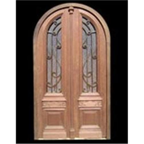 Rounded entrance door made in solid cedar wood. It has wrought iron inserts and hand carved details by craftsman on early 1900's. It has raised panels with moulding it the border. It has frosted glass on hinged shutters.