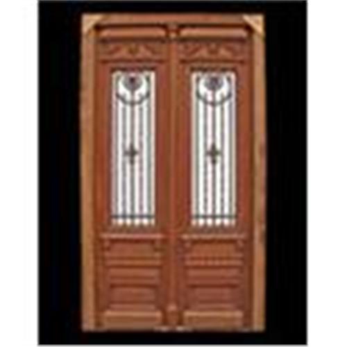 Antique entrance door with amazing wrought iron inserts made in solid cedar wood to early in the 1900s. The inserts are twisted with nicely forged iron flowers. This door have amazing hand carved details and raised panels with moldings. It's pre-hung on its frame.