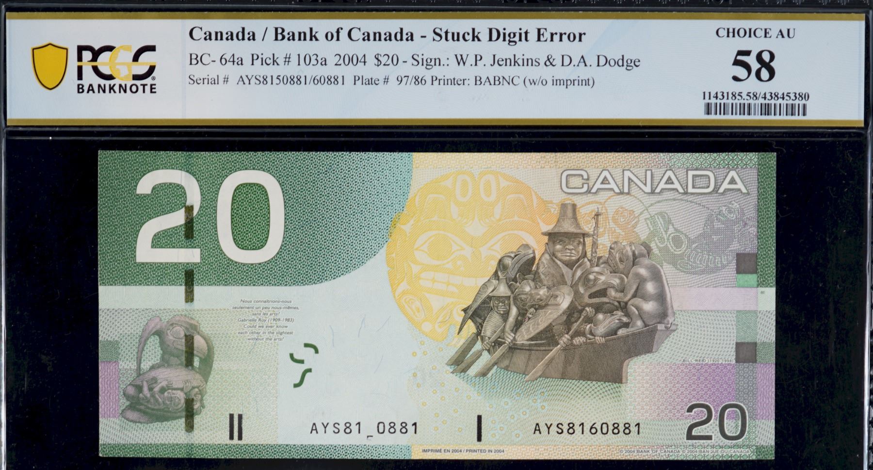 Double Error; 2004 $20 BC-64a #AYS8150881-AYS8160881 PCGS Choice About Uncirculated-58. Mismatched Serial Numbers & Dropped Down Digit.