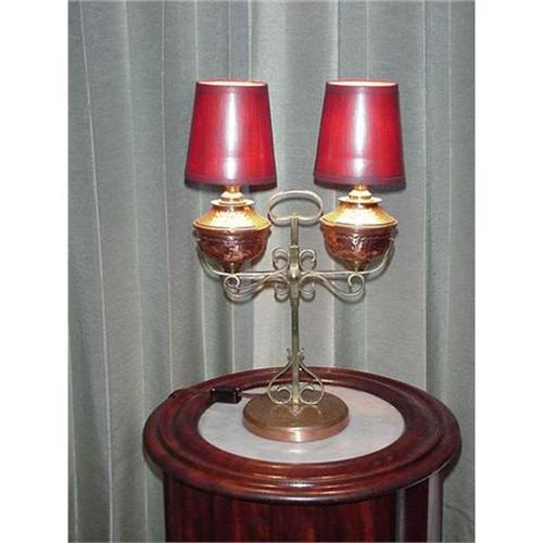 </font></strong>Brass and Copper Double Font Oil Lamp, 15" tall, 9 1/2" wide. Circa, 1900, French. Converted to electricity, exterior wiring with two way switch on cord. Paper shades.</font>