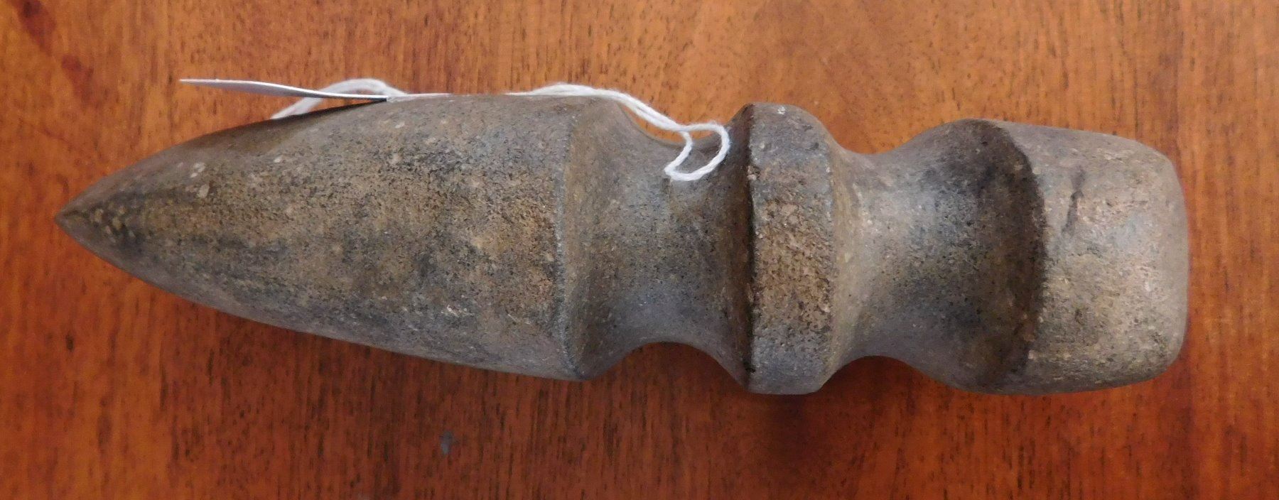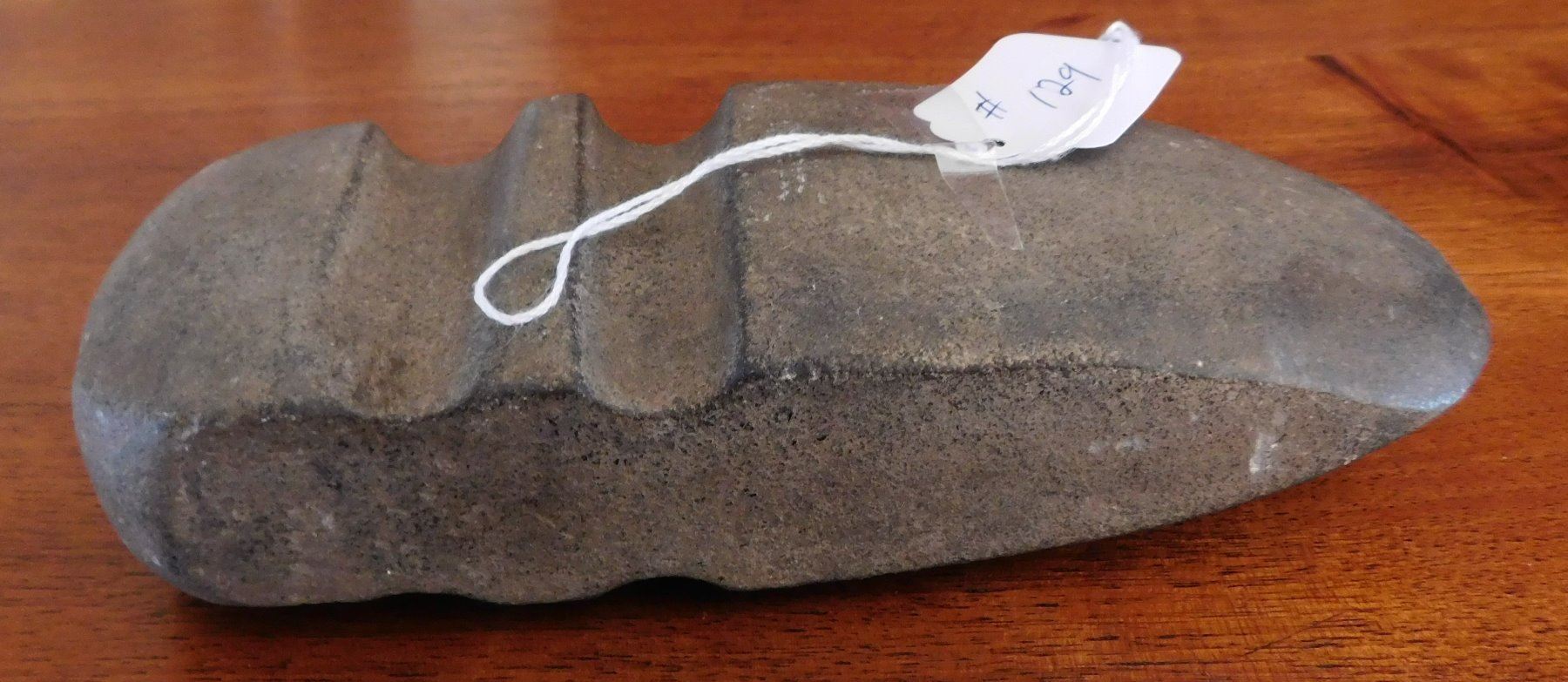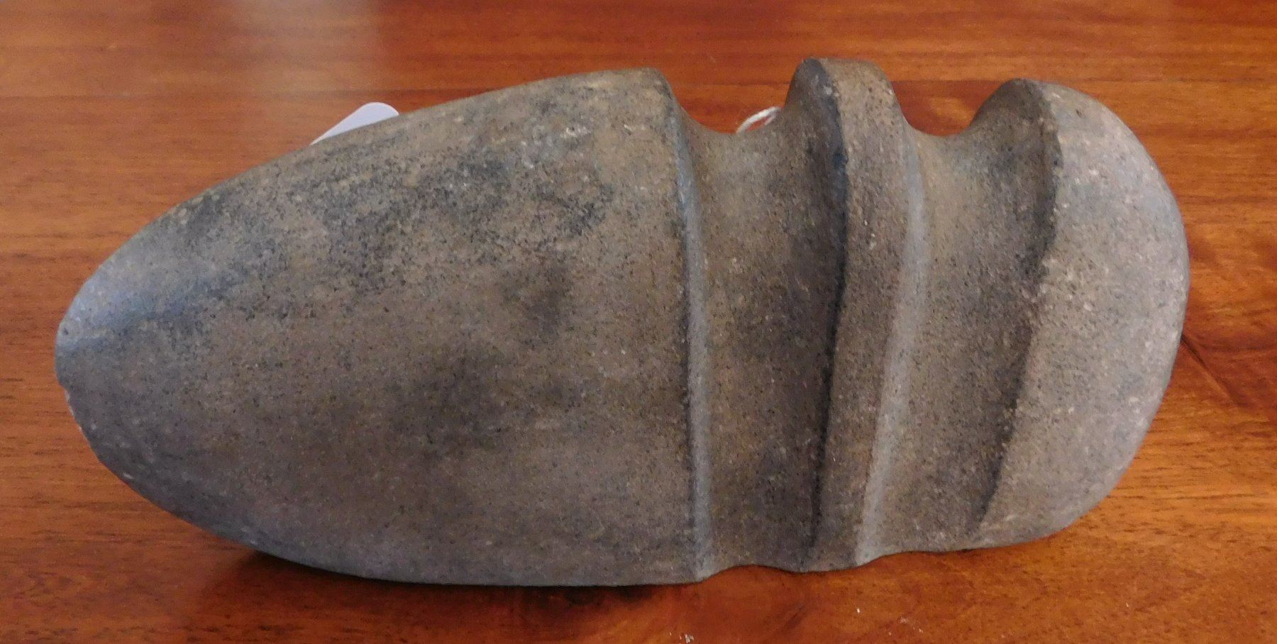 Double Groove Axe, pre-historic. Made of basalt, the item measures 7" long. Iowa. Rare double groove. Condition: Good, see images. Shipping: $16.50 w/insurance and signature.