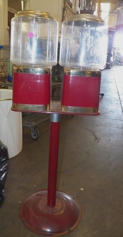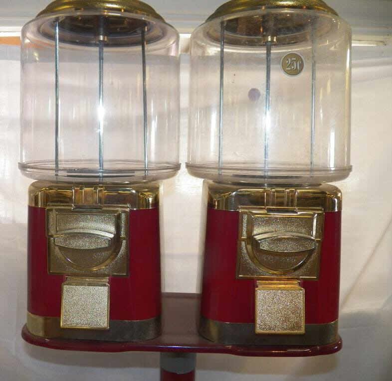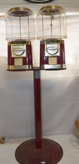 Double Gumball & Candy Machine with Retro Stand with 2 Barrel Shaped Gumball or Candy vending machines on a iron stand with Key