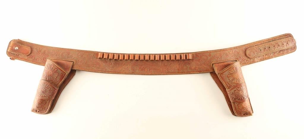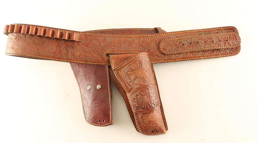 From the Jim Lockwood Prescott Leather Maker Collection, includes a rig that is similar to the Red Ryder rig. This is floral tooled, reverse draw rig for a colt single action, missing buckle made by Jim Lockwood from Legends in Leather. Overall length is approx 43".