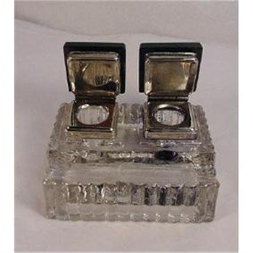 </font></strong>Vintage double inkwell desk standish - pressed glass lower, with plated tops to inkwells, and black lids - I think these are probably onyx, but can?t tell. There is a curved pen rest in the glass in front of the inkwells.