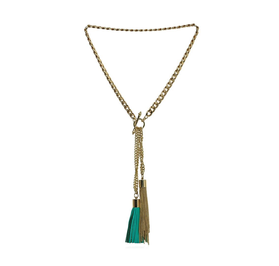 High end designer jewelry. Double Leather Tassel Chain Necklace - Gold Plated. Gold Plated Metal/3" Ext Clasp. Aqua/ Gold. 28/6.5inches. Total Weight: 119.4 grams.