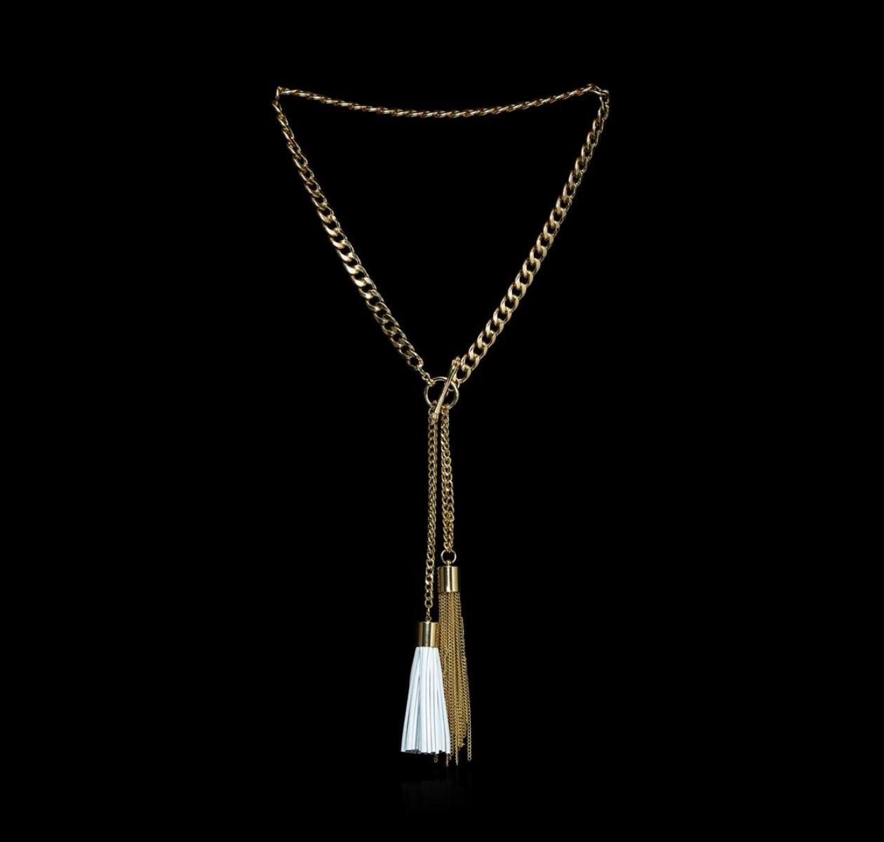 High end designer jewelry. Double Leather Tassel Chain Necklace - Gold Plated. Gold Plated Metal/3" Ext Clasp. White/gold. 28/6.5inches. Total Weight: 120.5 grams.