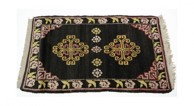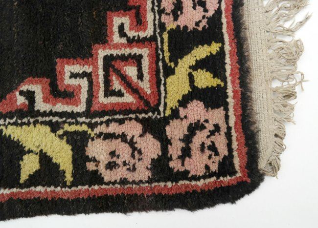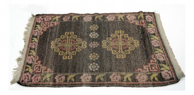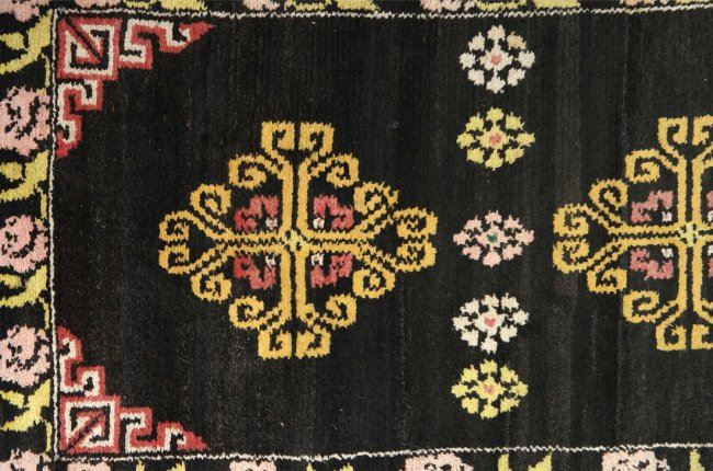 Tibetan-style runner with medallions in center and along the border. [60" x 35"]. Some moth damage.