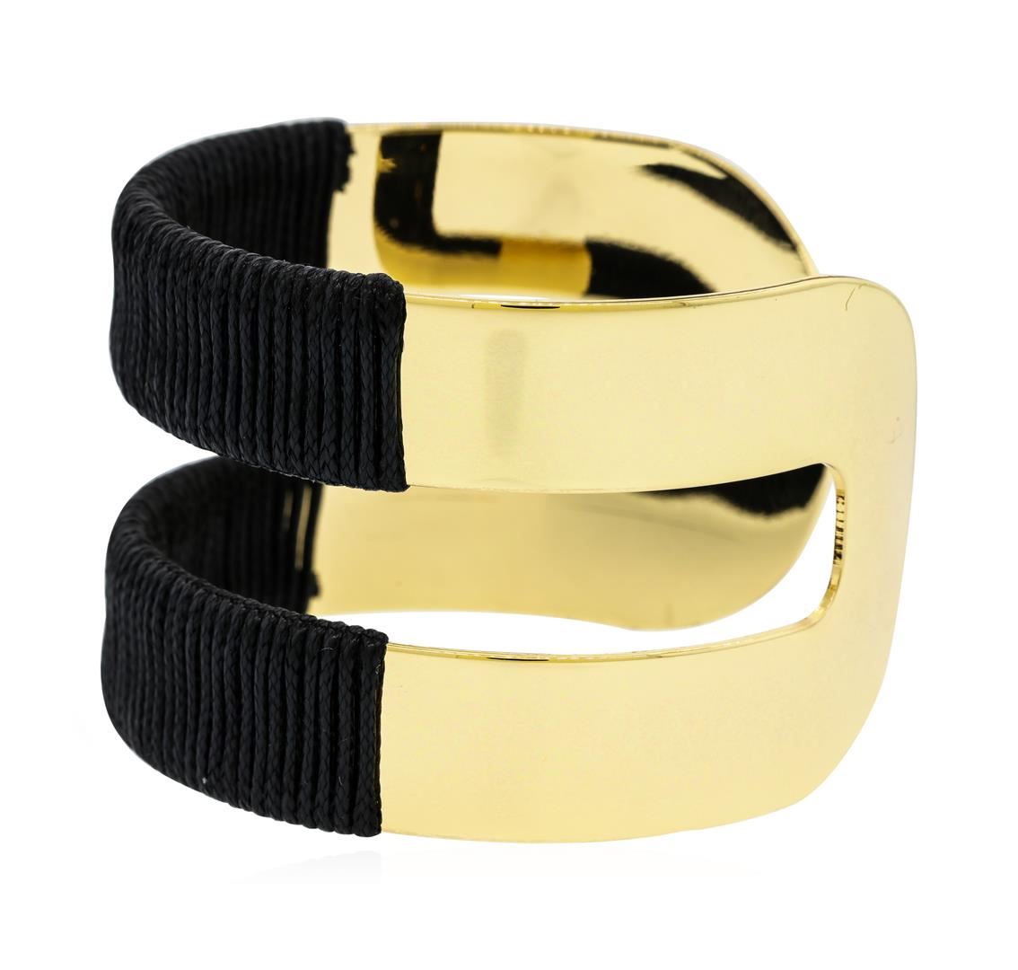 High end designer jewelry. Double Metal Strand Leather Cuff Bracelet - Gold Plated. Gold Plated Metal. Black/ Gold. Adjustable. Total Weight: 43 grams.