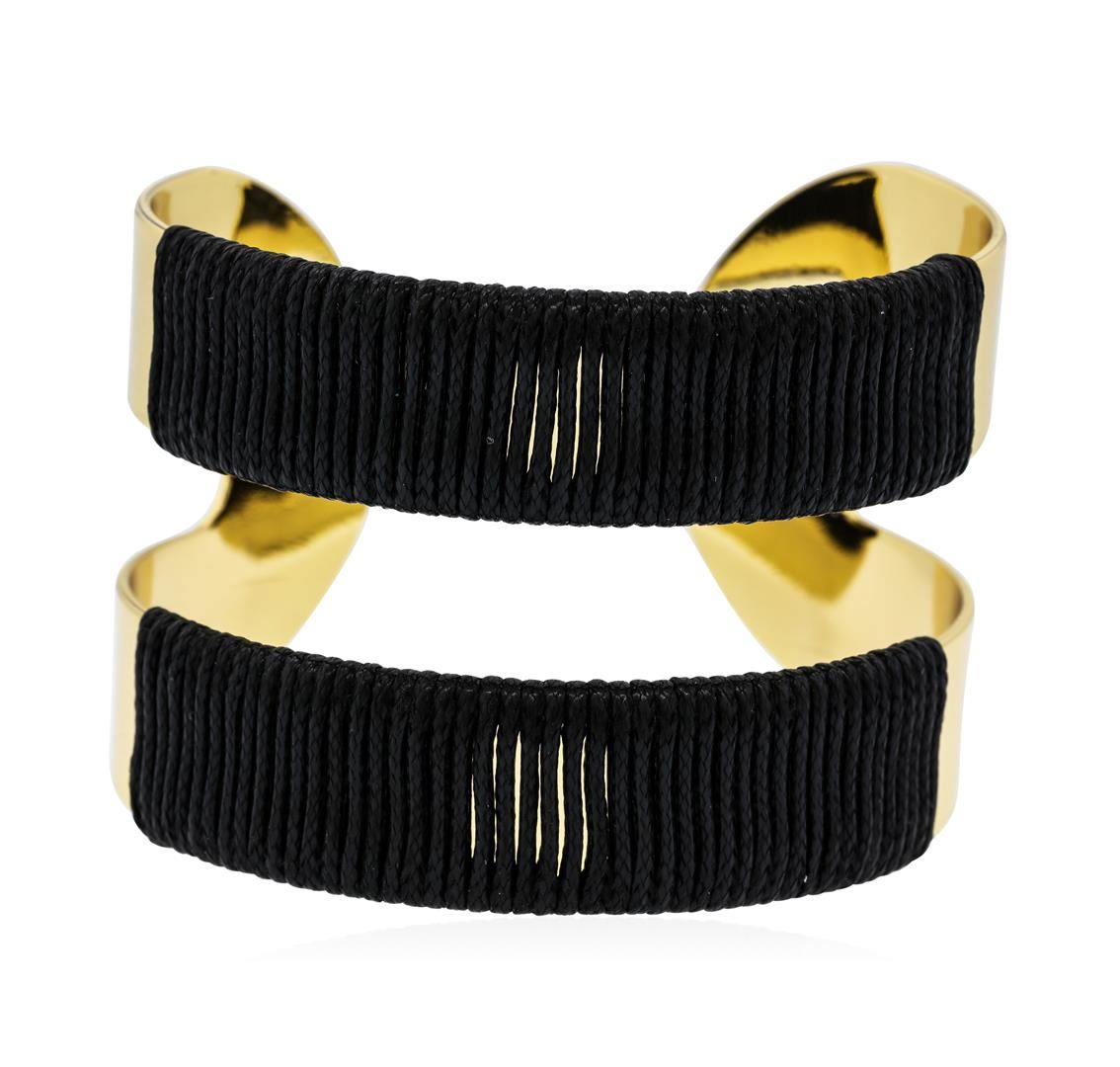 High end designer jewelry. Double Metal Strand Leather Cuff Bracelet - Gold Plated. Gold Plated Metal. Black/ Gold. Adjustable. Total Weight: 43 grams.