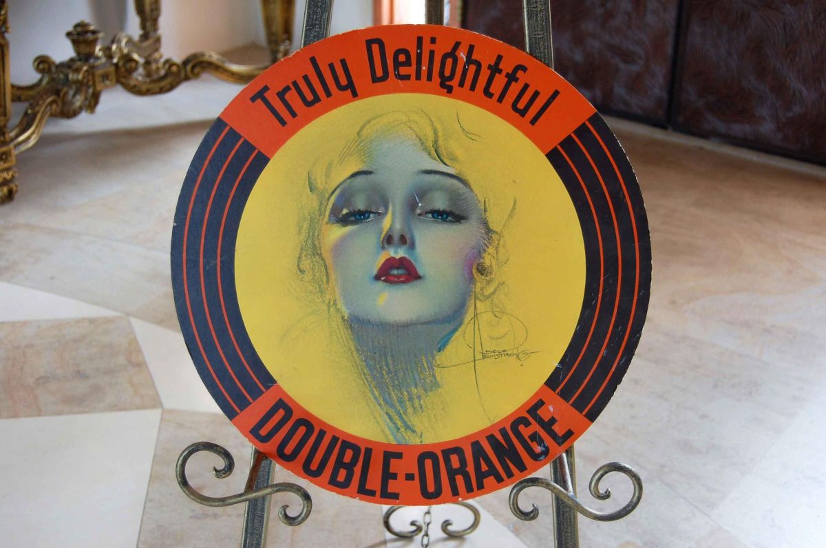 Double Orange Soda Cardboard Sign. Ralph Armstrong illustration. Light wear and nick about right eye and slight edge wear otherwise good condition. 18 inch diameter.