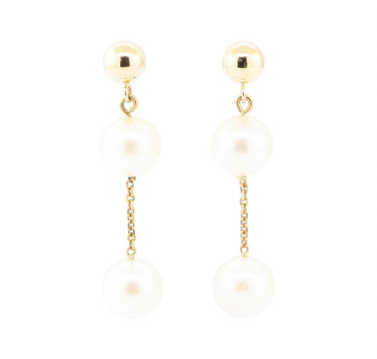 One pair of double dangle pearl earrings, with a drop of approximately 31mm, featuring: 14KT yellow gold weighing 2.6 grams containing four white pearls measuring 7mm in diameter.