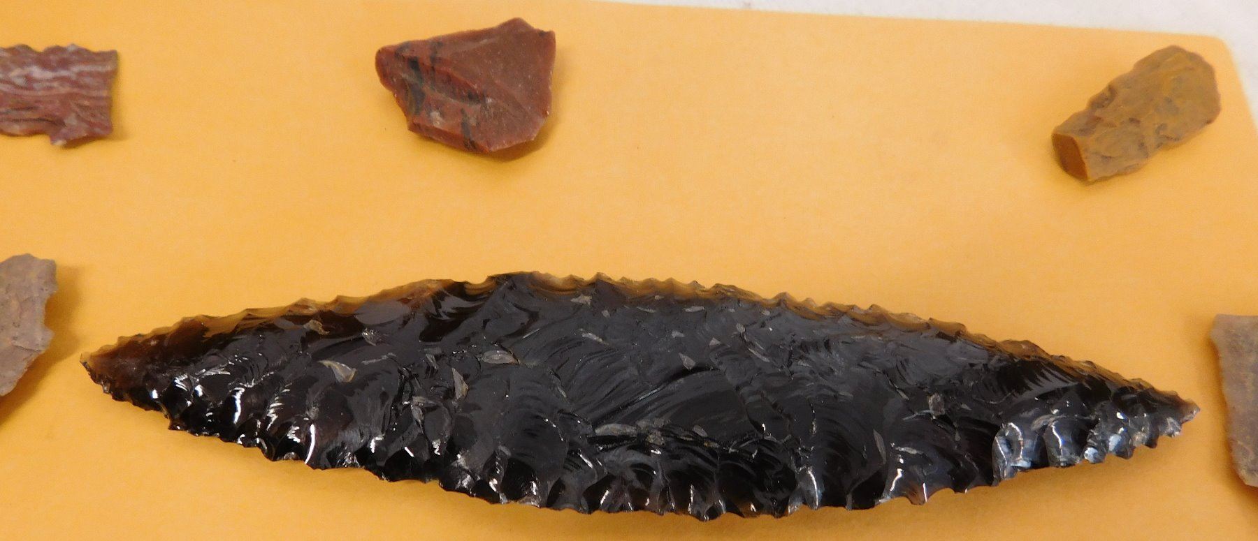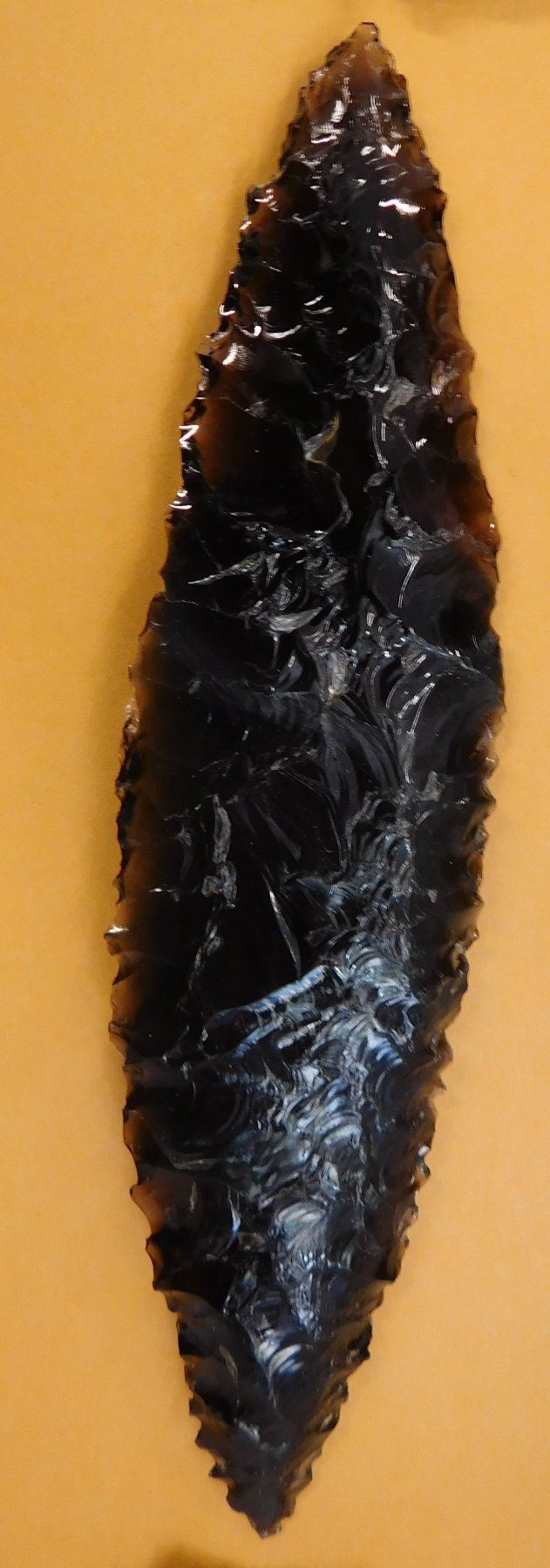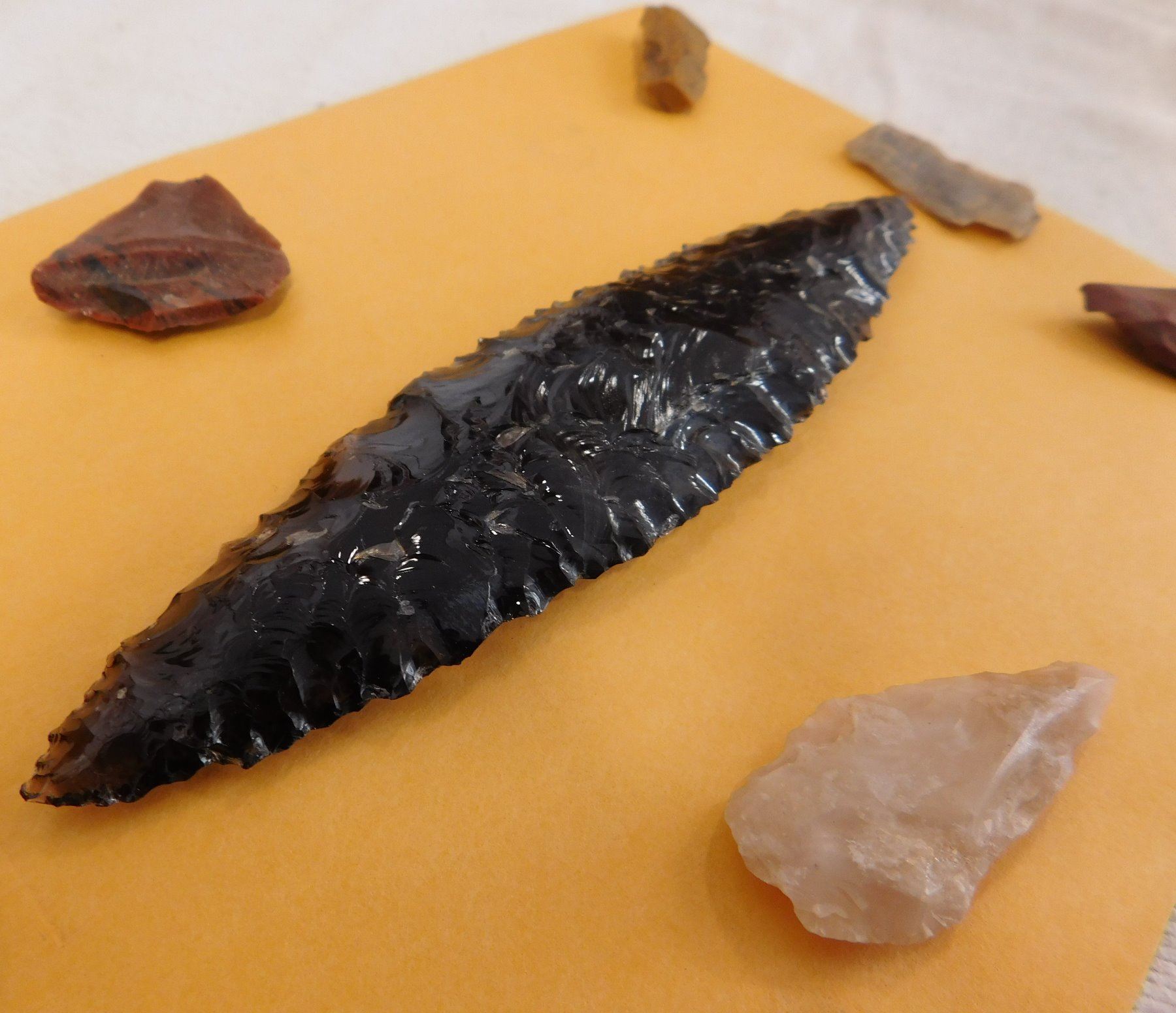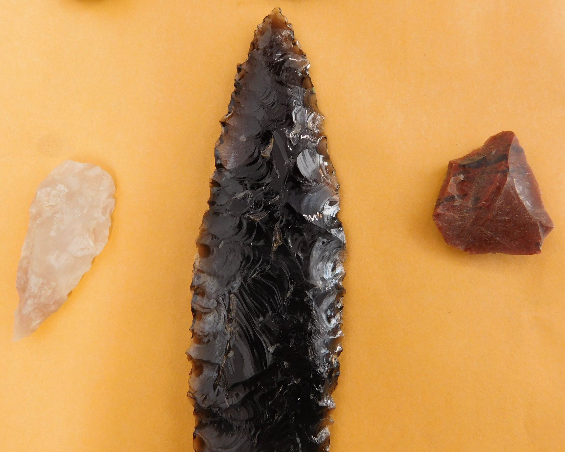 Double Pointed Obsidian Knife, pre-historic item. Lot contains obsidian and chert scrapers, the knife measures 6" x 1 1/2". Humboldt County, California. Translucent knife. Condition: Good, see images. Shipping: $20.00 w/insurance and signature.