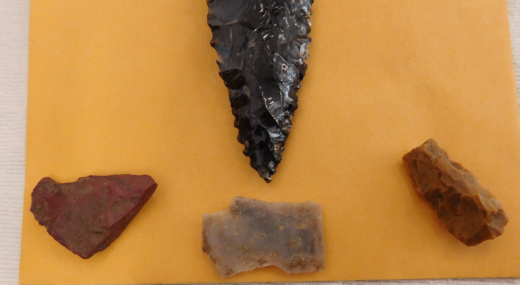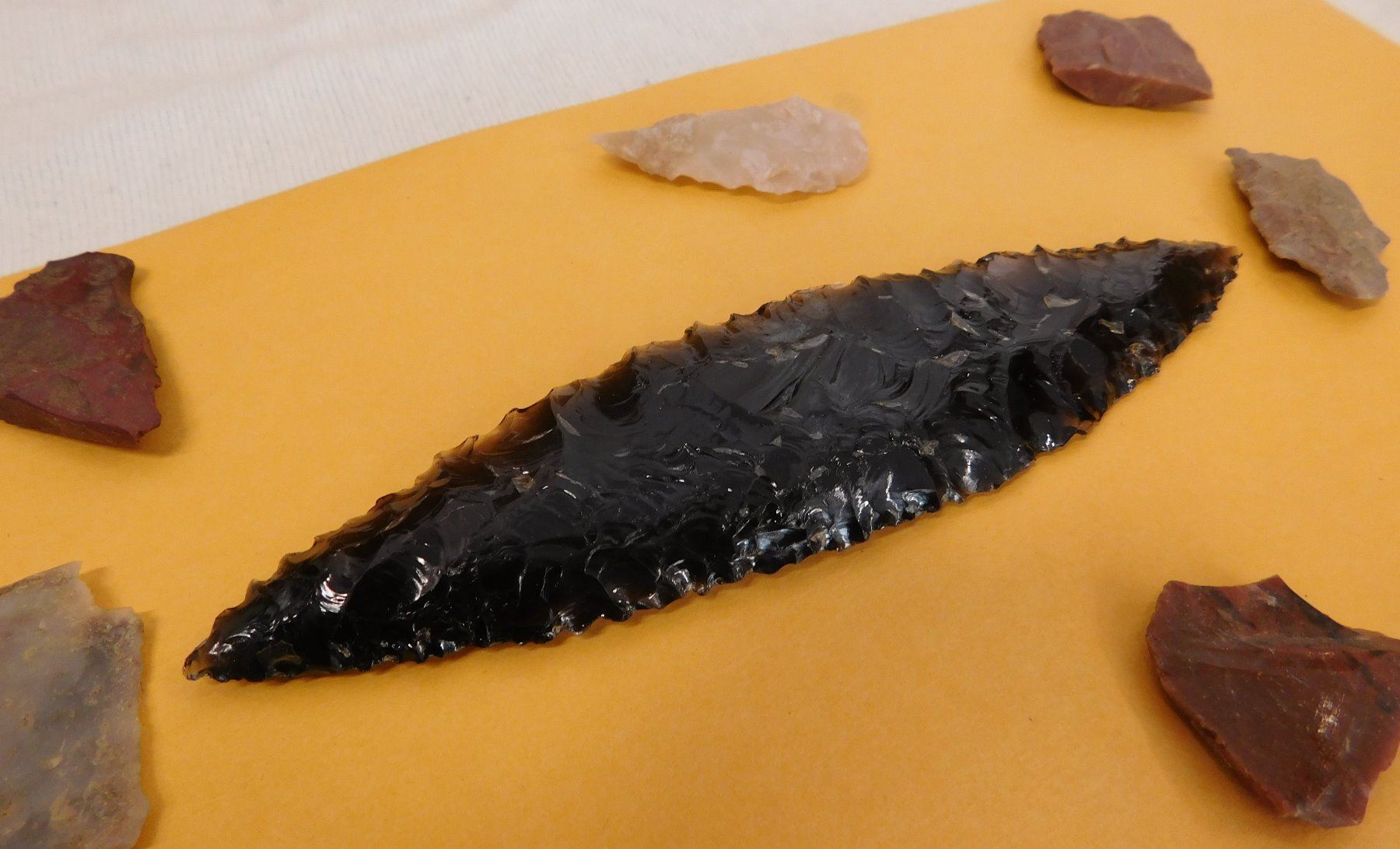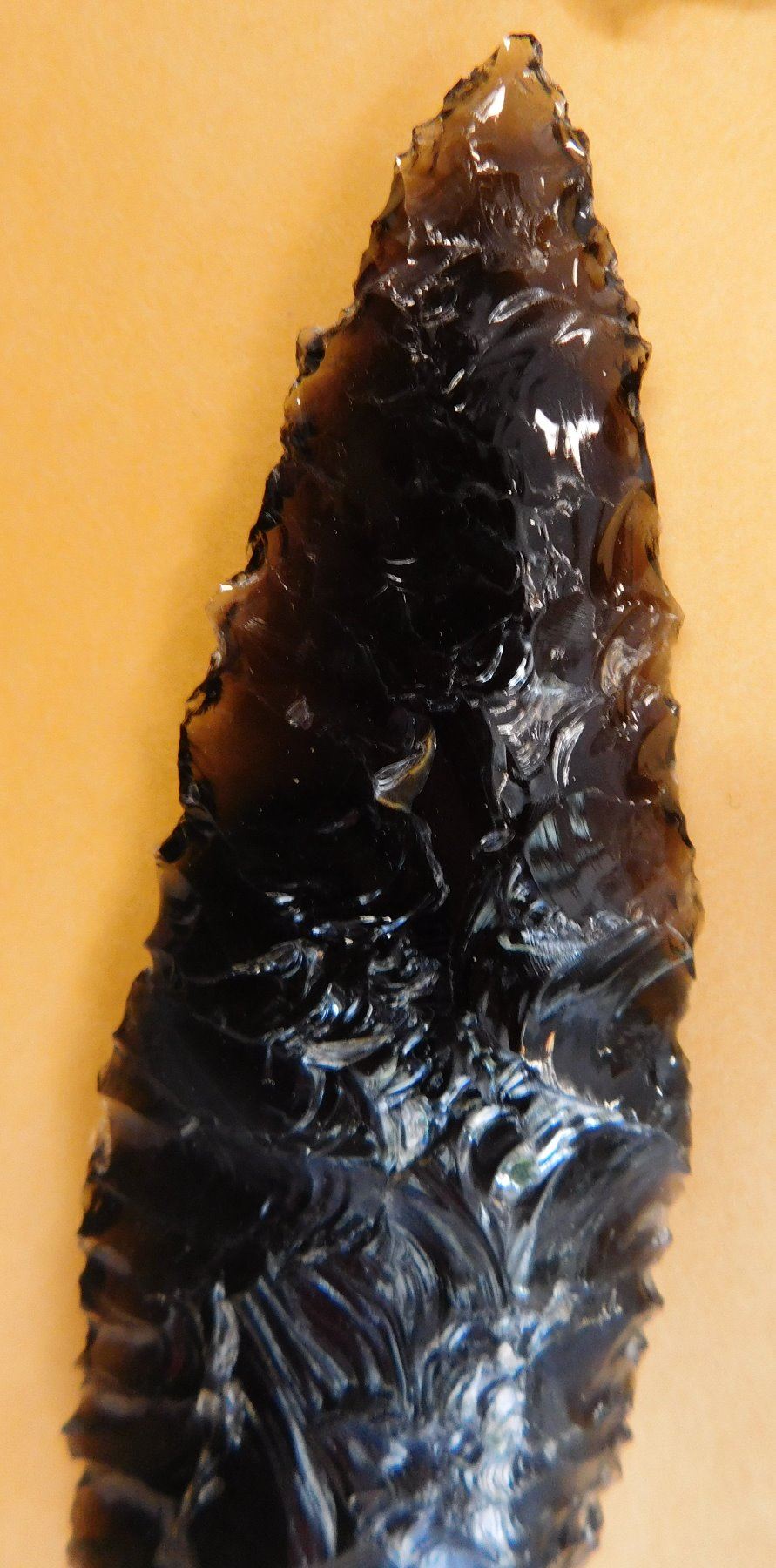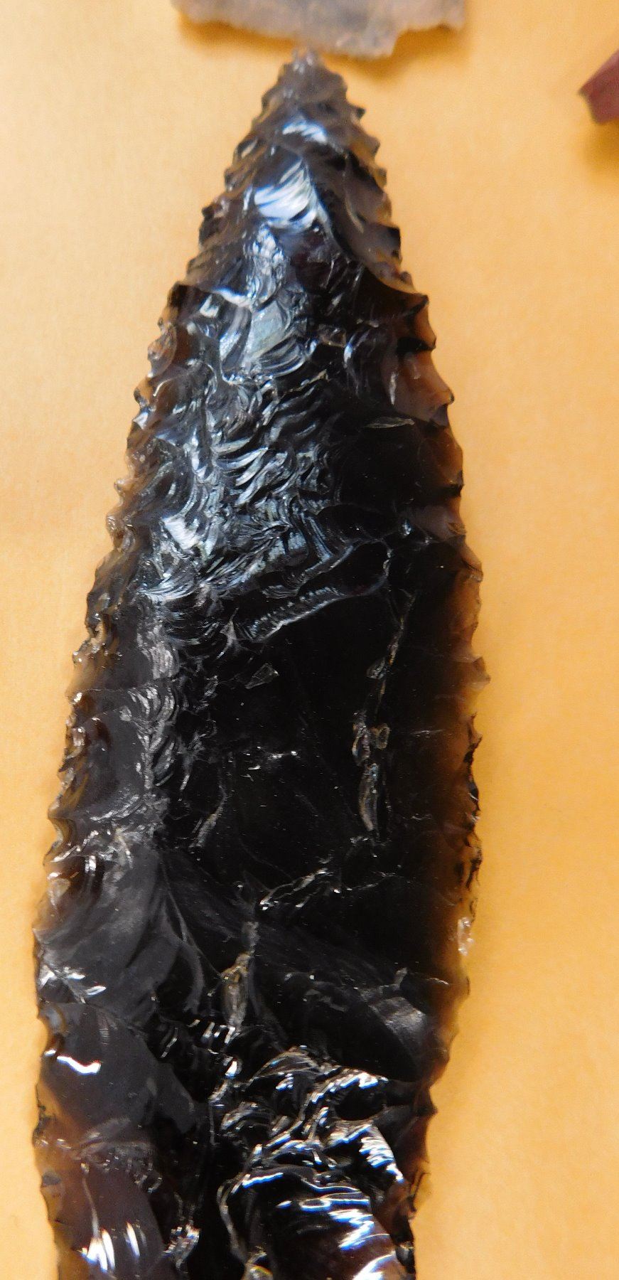 Double Pointed Obsidian Knife, pre-historic item. Lot contains obsidian and chert scrapers, the knife measures 6" x 1 1/2". Humboldt County, California. Translucent knife. Condition: Good, see images. Shipping: $20.00 w/insurance and signature.