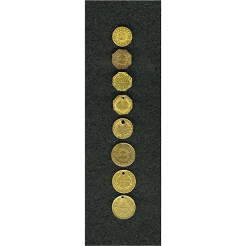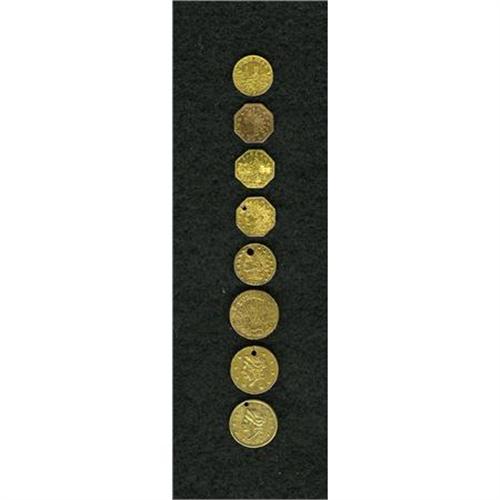 <B>Double Quartet of California Gold Charms, Damaged Real Coins.</B></I> A mixture of four real gold charms (not the modern kind) and four holed real California gold coins. Some of the charms are the type with Eureka on the obverse in both formats, octagonal and round. Catalog numbers for the holed real California gold pieces include BG-1011, BG-869, and BG-414. The collecting of the charms alongside the real coins has increased and should get more popular as time goes on. Viewing of this lot is recommended.<BR><BR><b>Shipping:</b> Coins & Currency (<a target="_blank" href="http://www.heritageauctions.com/common/shipping.php">view shipping information</a>)