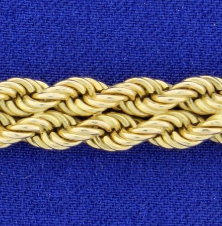 In 14K yellow gold it is 8 inches long and 7.6mm thick and has a lobster clasp. 10.2g